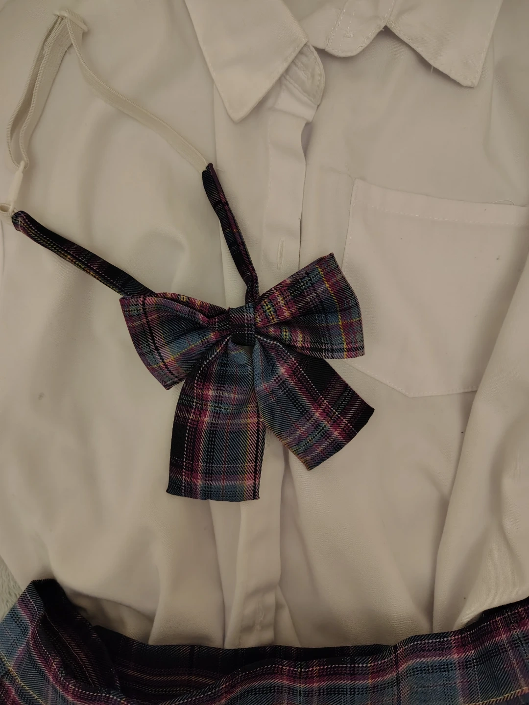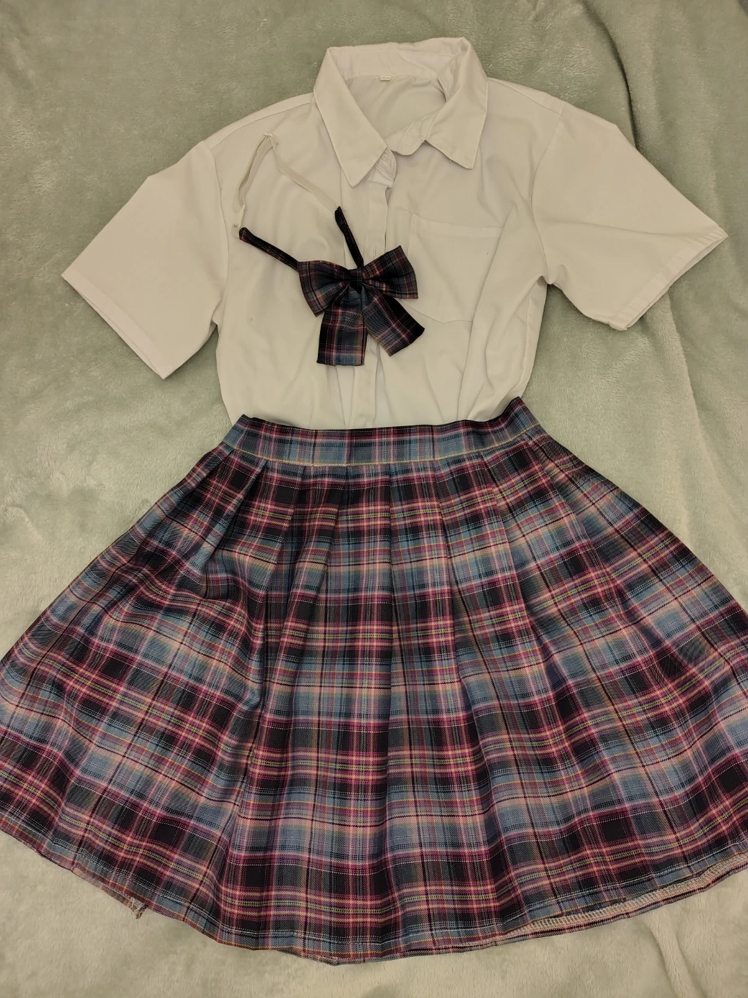 This is a white short-sleeved school uniform shirt with a plaid pleated skirt and matching bow tie. The skirt has a blue, pink, and black plaid pattern. It's a classic look!
