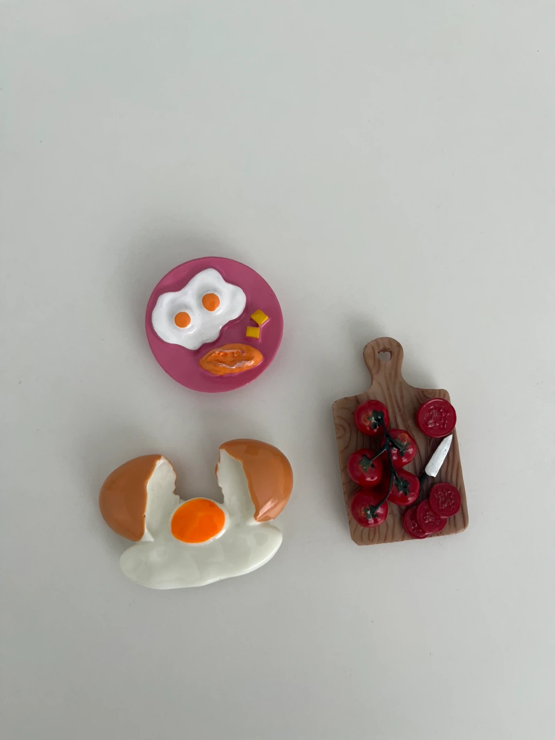 These are adorable food-themed miniature magnets. The set includes a plate of sunny-side-up eggs, a cracked egg, and a cutting board with tomatoes.