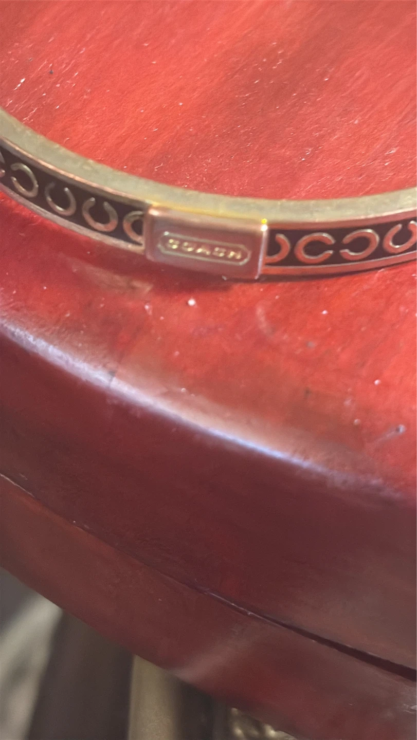 Coach bangle bracelet with signature 'C' pattern. Gold-tone metal with black enamel details. This classic accessory adds a touch of elegance. Was well loved and shows its wear. But this is free