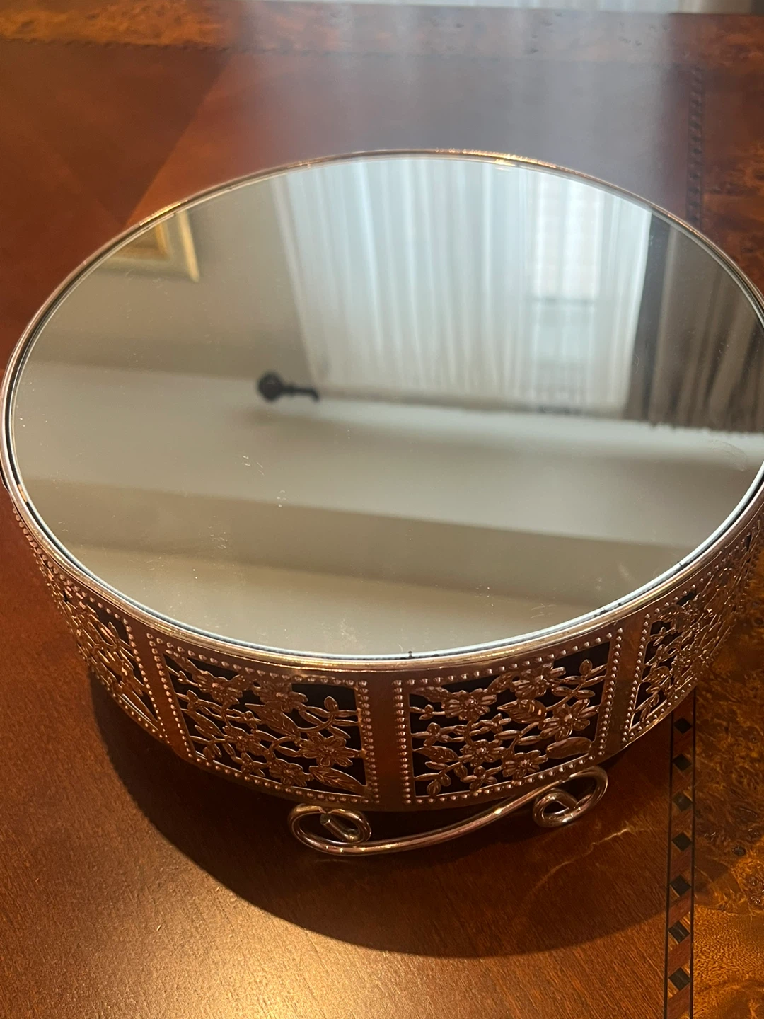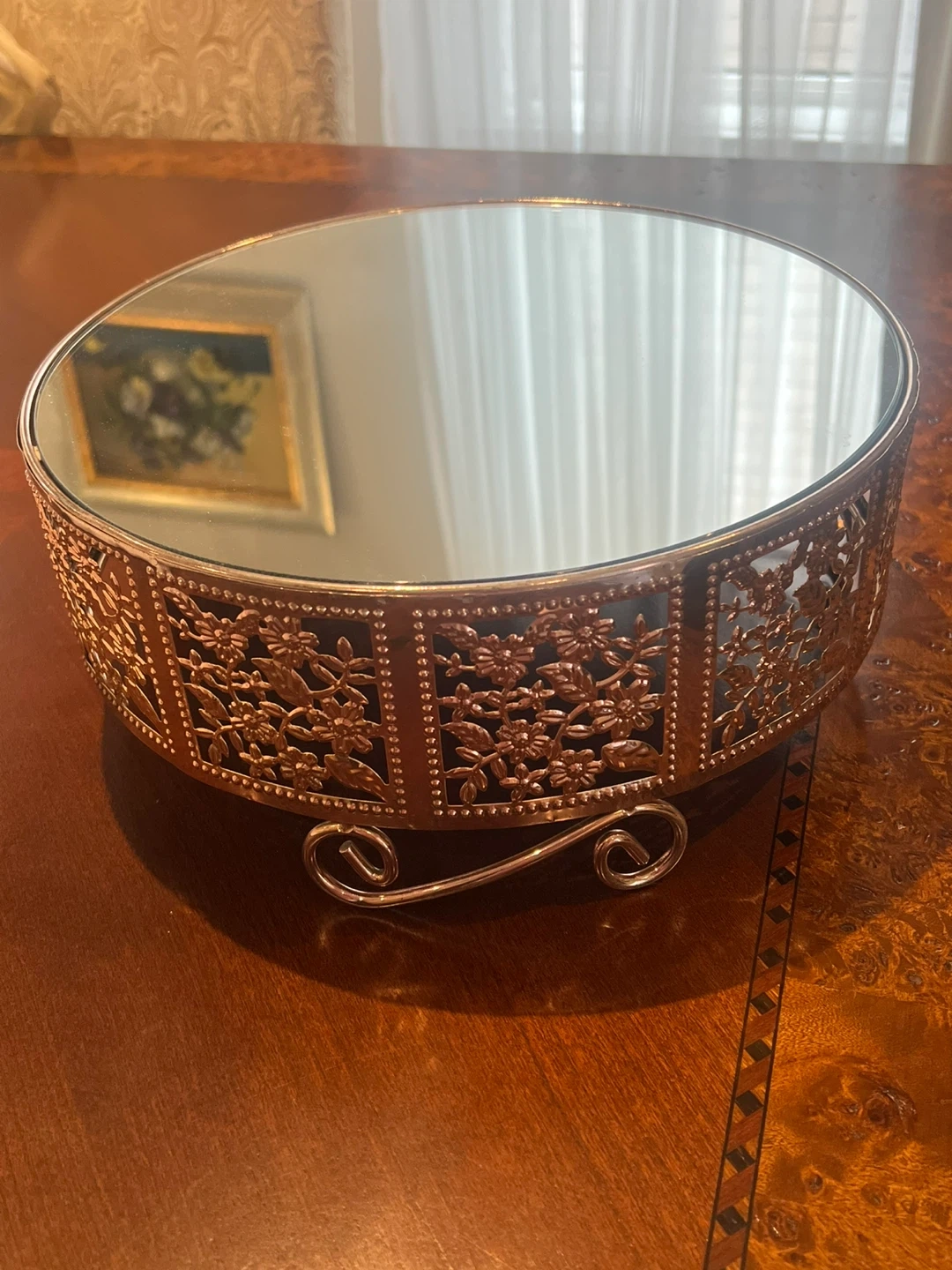 This decorative cake stand features a mirrored top and a rose gold coloured metal base with a floral cut-out design. It's perfect for displaying cakes or as a centrepiece for special occasions. Metal construction.