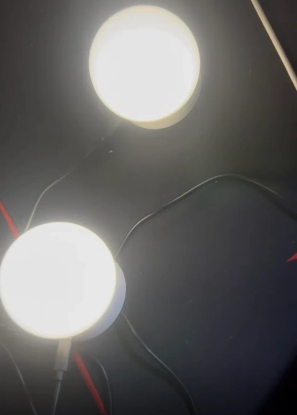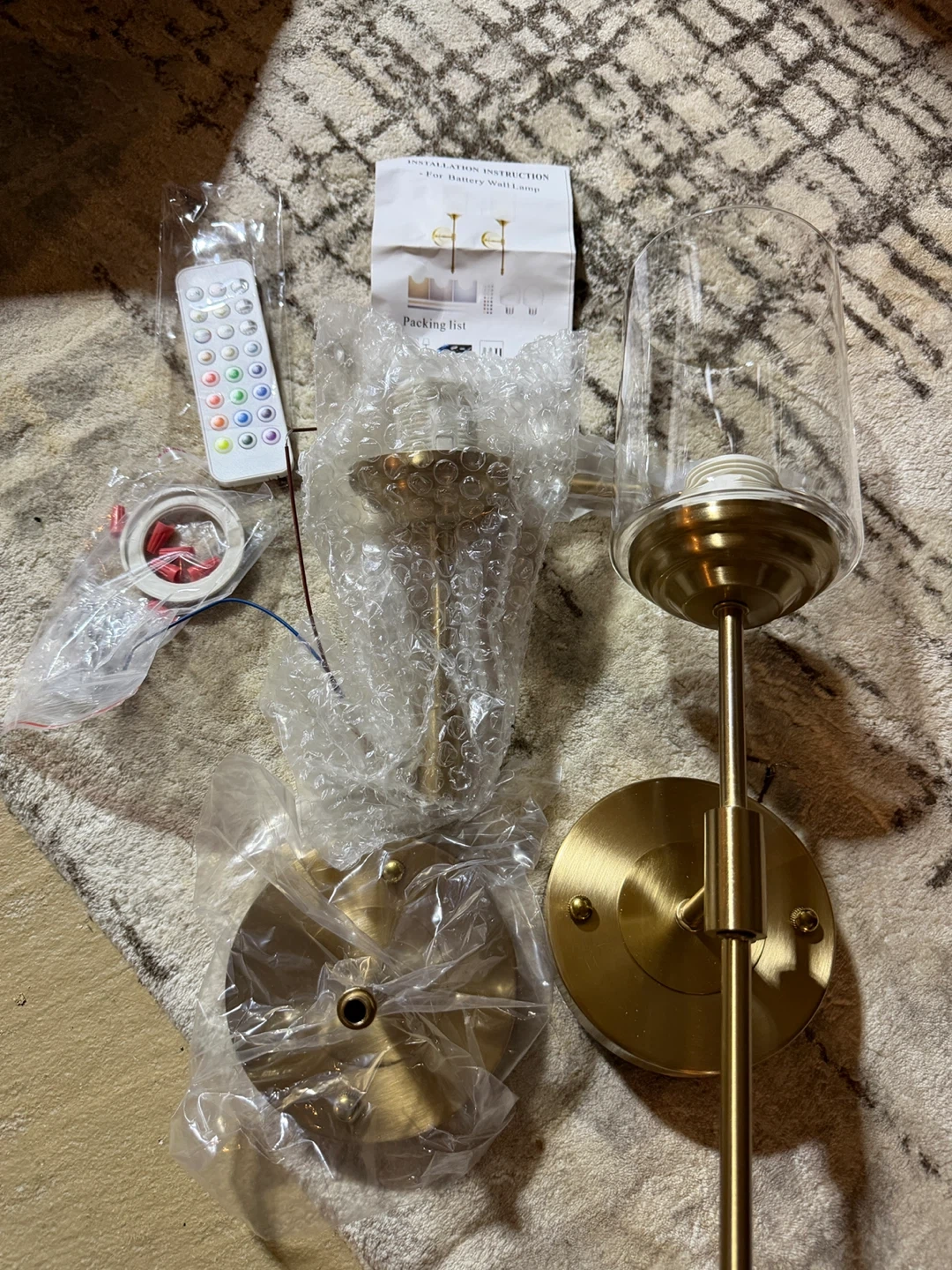 Includes two brass-toned wall lamps with glass shades and rechargeable LED bulbs.