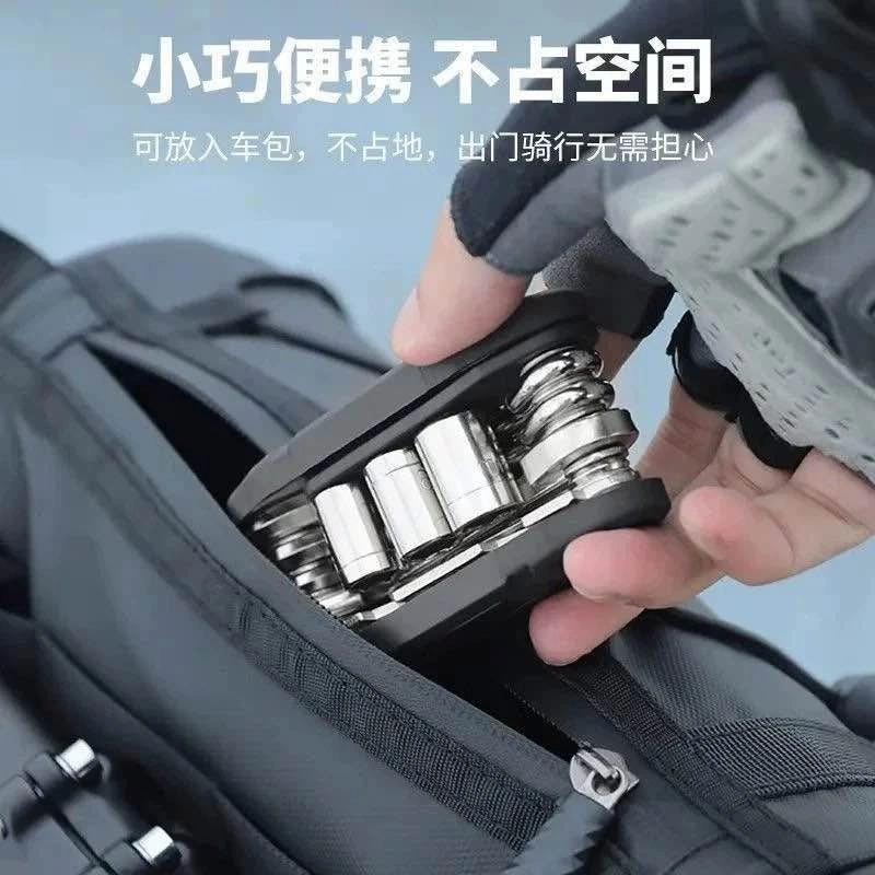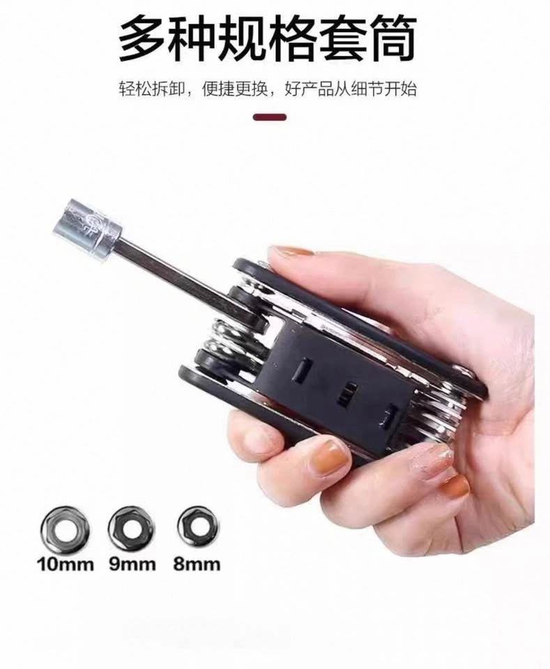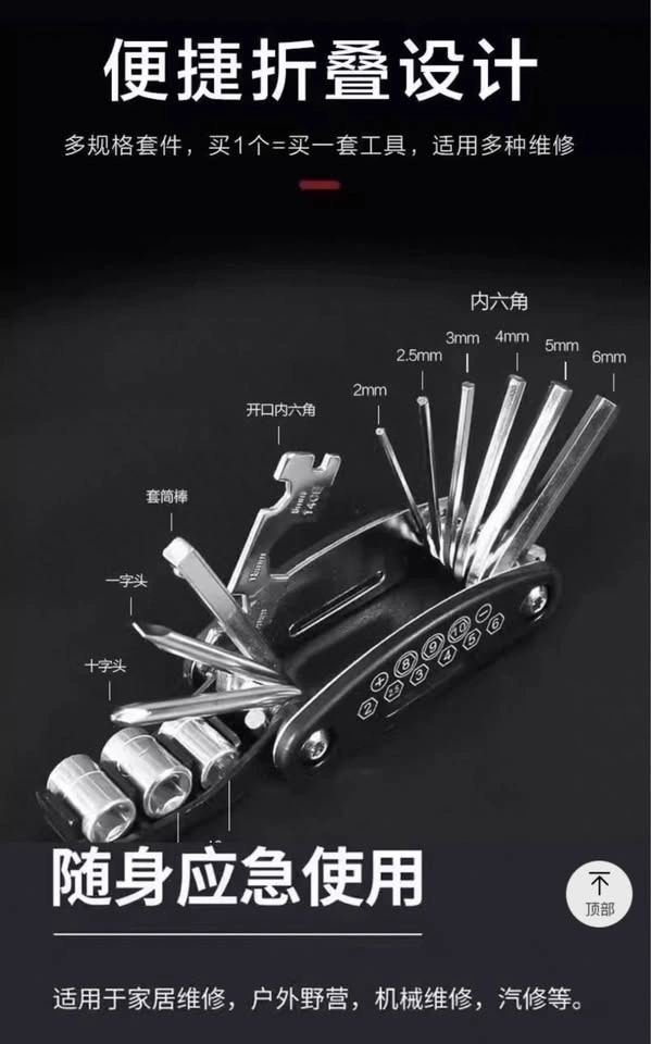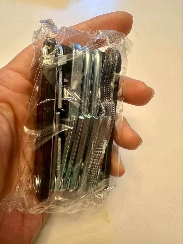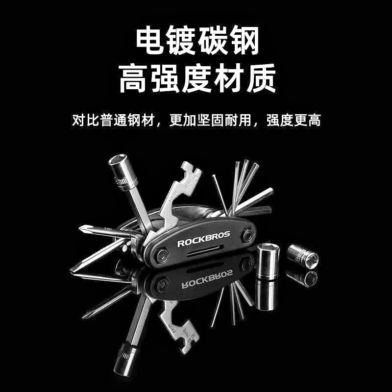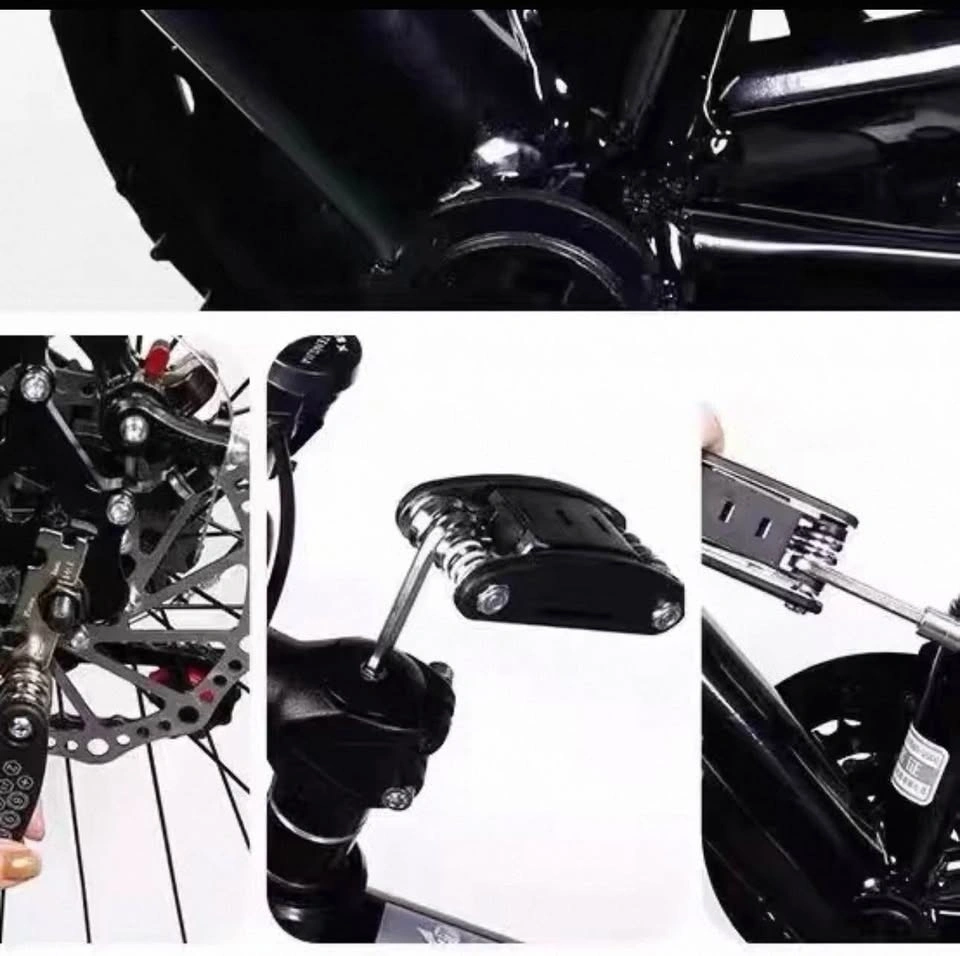 Brand new, black carbon steel 16-in-1 multi-tool for bicycle maintenance. Includes various hex keys (2-6mm), socket wrenches (8/9/10mm), solid wrenches (8/10/15mm), screwdrivers, extension rod, and spoke wrench. Great for on-the-go repairs or home use. Durable and portable.