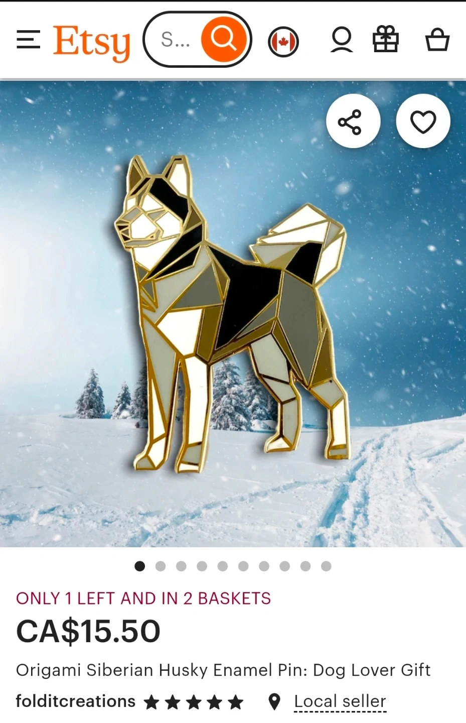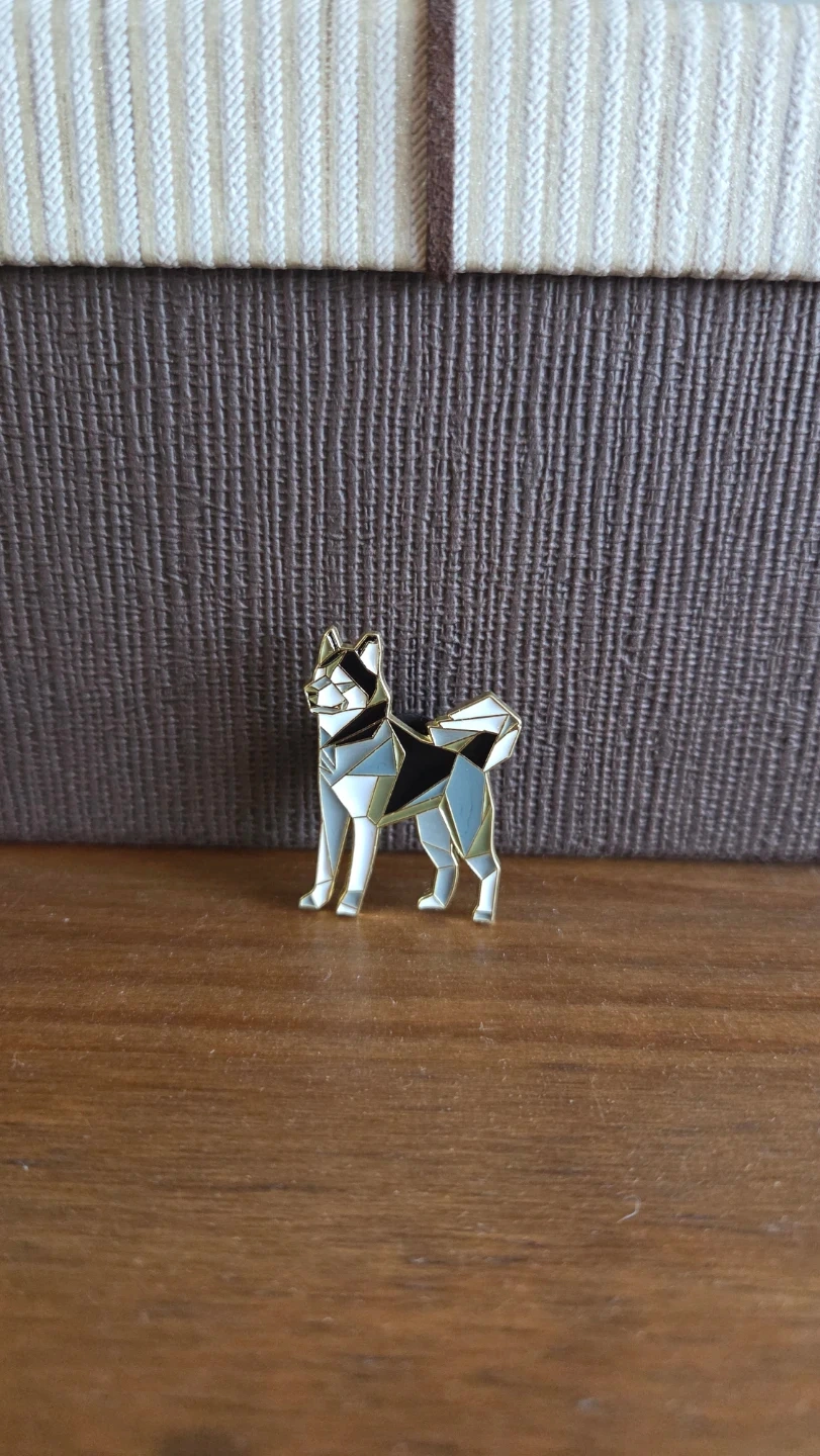 This is a brand new geometric origami-style enamel pin featuring a Siberian Husky. The pin has a gold-toned metal base with enamel detailing in black, white, and grey. It's perfect for adding a touch of personality to jackets, bags, or hats!