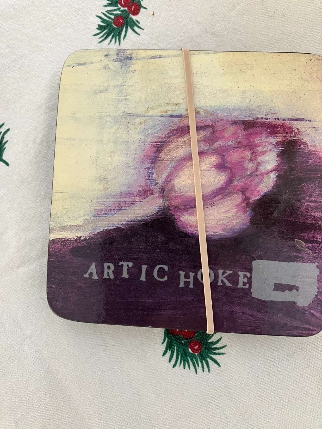 Set of four coasters with an artistic artichoke design. These coasters are made of wood. They're perfect for protecting surfaces from drinks. 5 Coasters