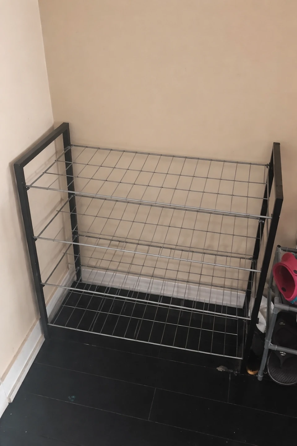 This is a 4-tier wire shoe rack with a metal frame. It's great for organizing footwear. The shelves are made of metal wire.