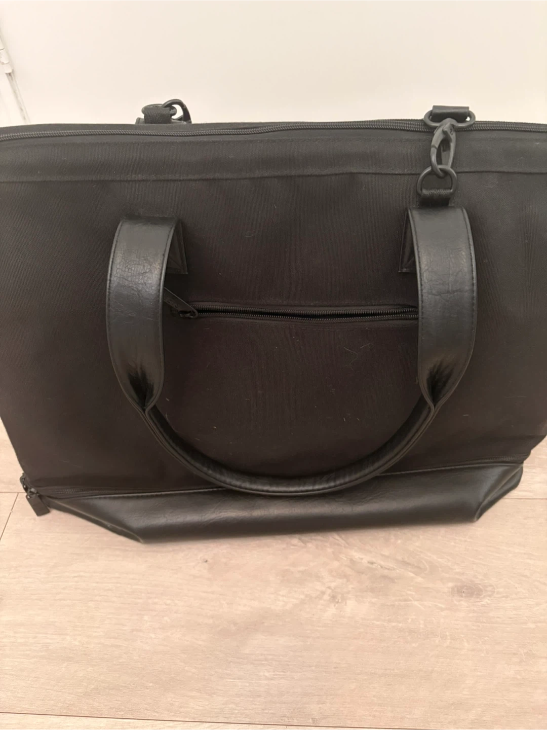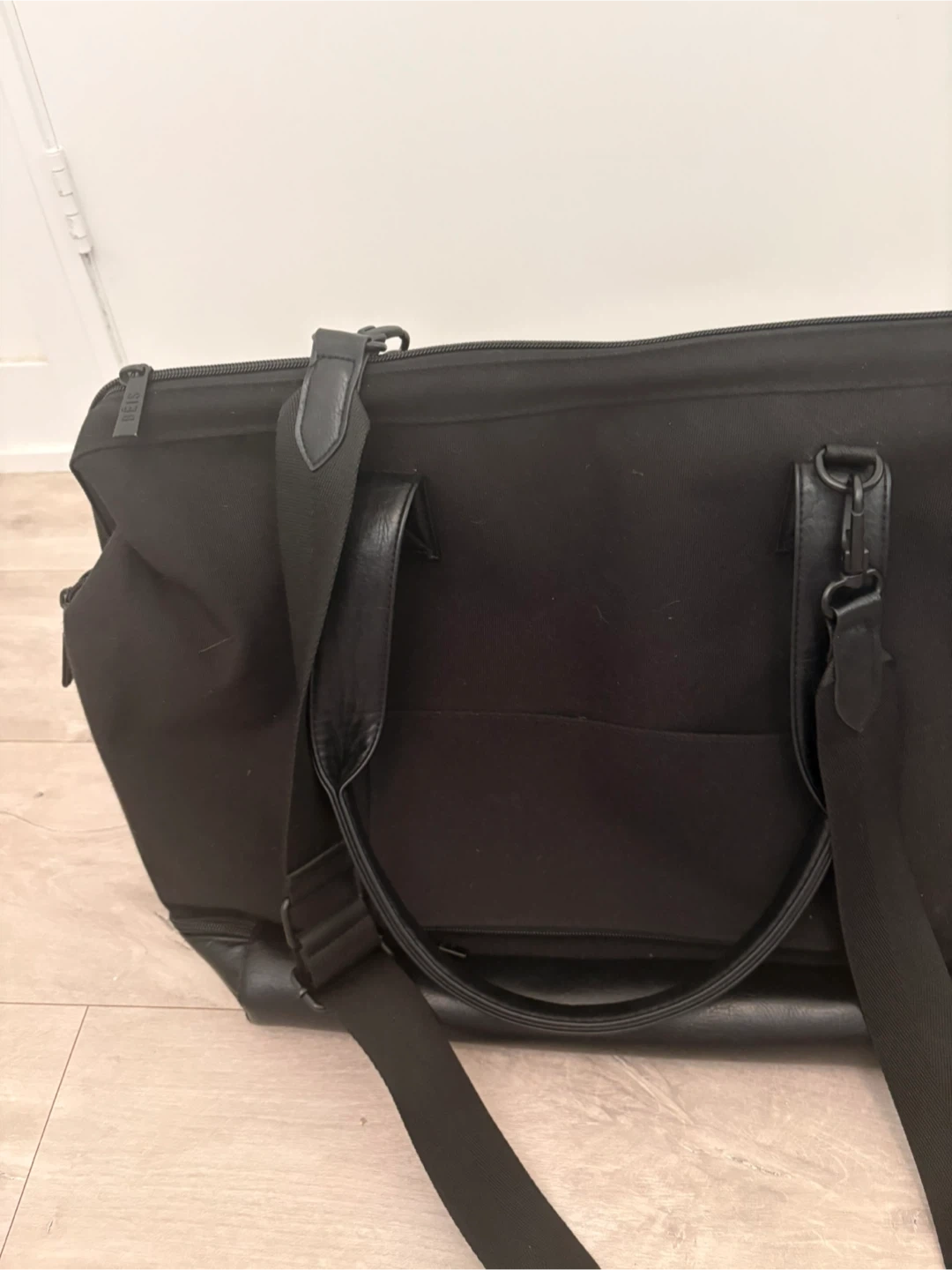 BEIS black weekender bag. It's made of durable canvas with faux leather accents. Lots of pockets for organization. Includes shoulder strap, trolley pocket, and shoe compartment