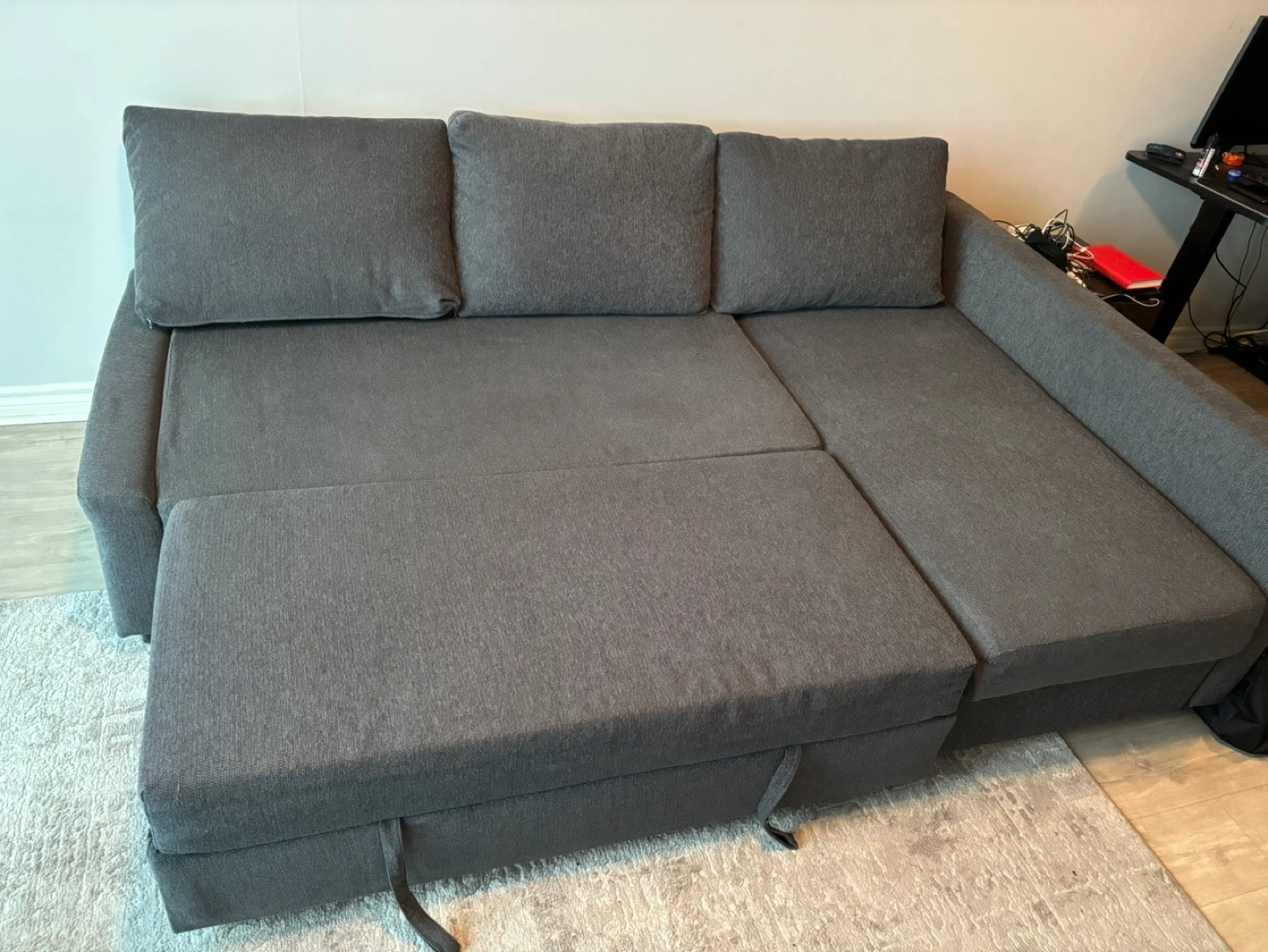 Dark grey fabric. Three back cushions. Pull-out bed. Includes chaise lounge.