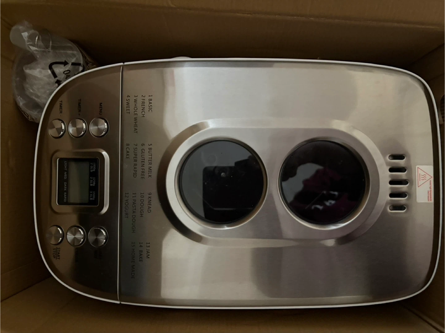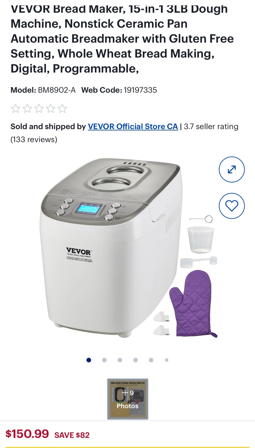 VEVOR breadmaker with 15 settings, including basic, French, whole wheat, and gluten-free. It has a 3lb capacity and a programmable digital display. Includes original box.