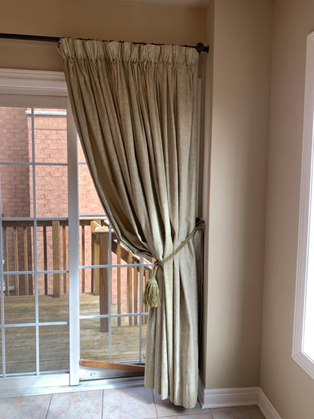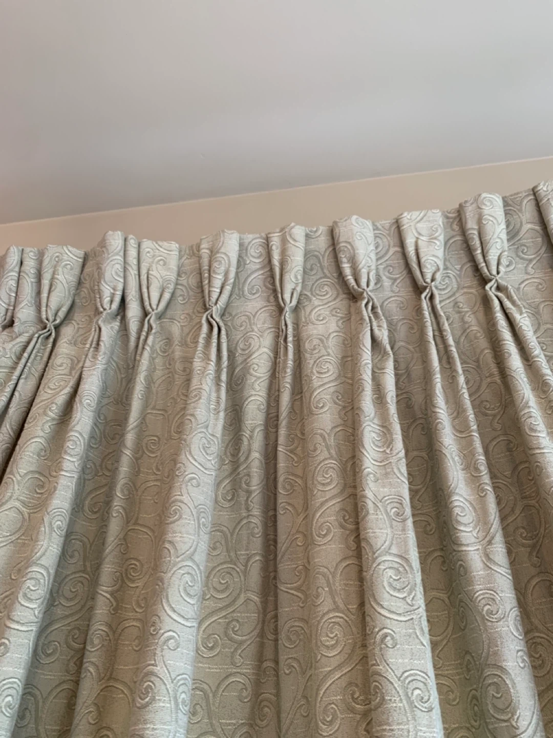 A single pleated curtain in a light green colour with a subtle swirl pattern. It's finished with a matching tassel tie-back. Adds a touch of elegance to any room!