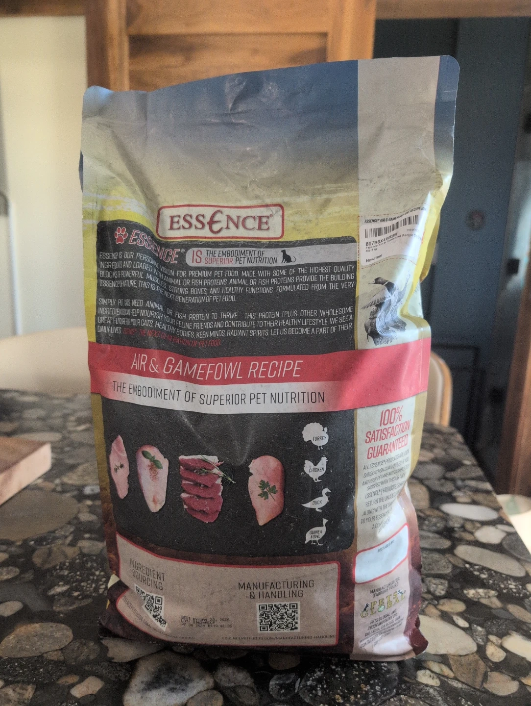 Essence Air & Gamefowl Recipe dog food bag. Made with animal protein ingredients and other wholesome ingredients. Complete and balanced for adult maintenance. Manufactured in the USA with globally sourced ingredients.