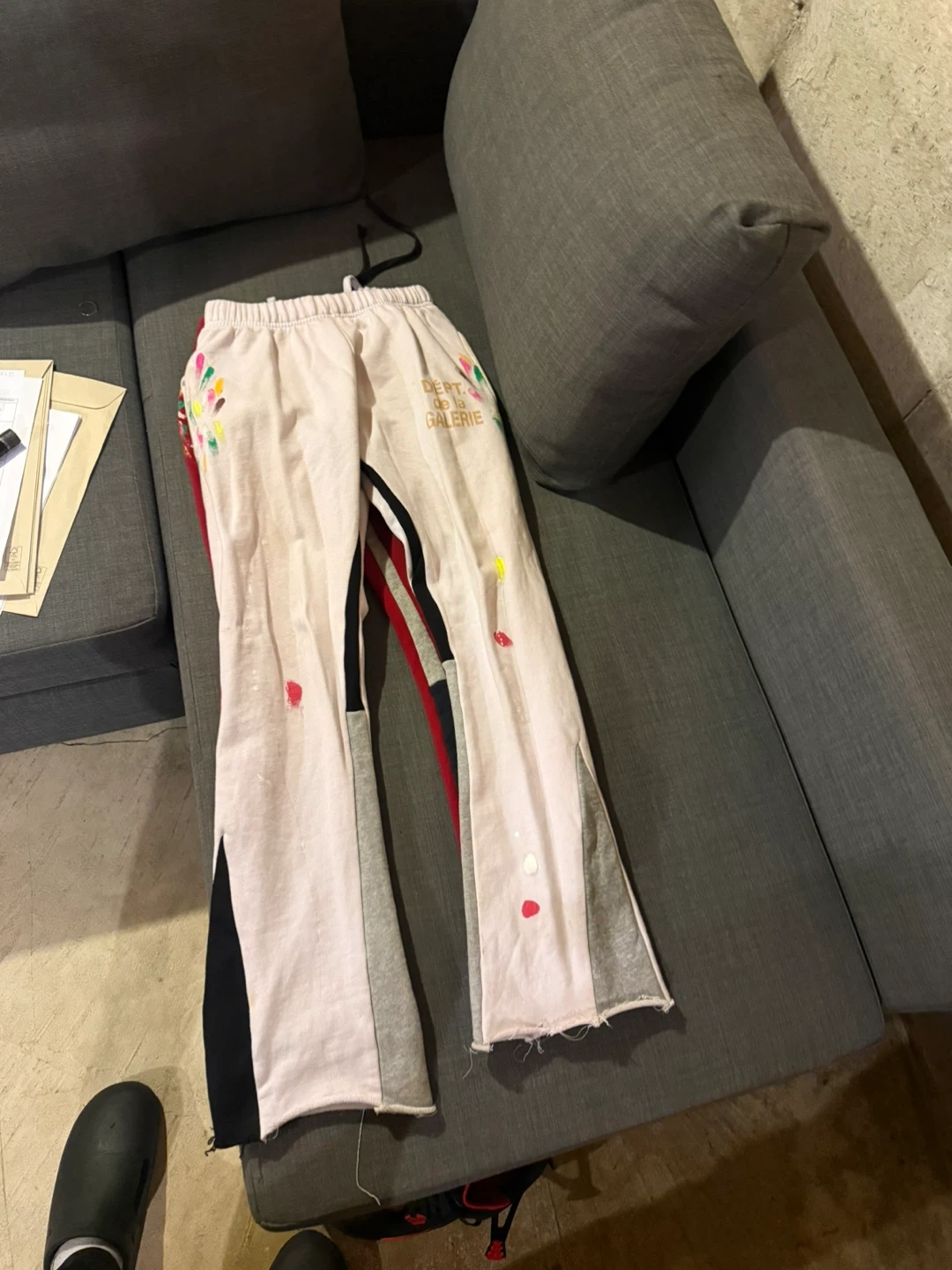 Gallery Dept. flared sweatpants with paint splatter details. These feature a patchwork design with contrasting panels. Comfortable for everyday wear! Selling individually