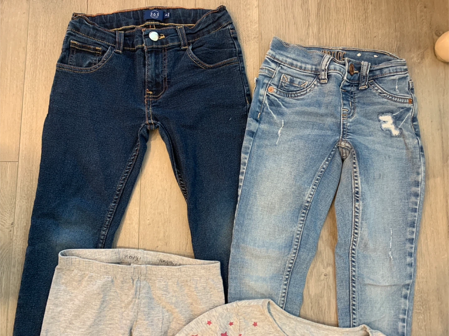 A bundle of girls' clothing including multiple pairs of pants and long-sleeved tops. Pants are denim and leggings in various colours and patterns. Tops feature fun graphics and designs. Great for everyday wear!