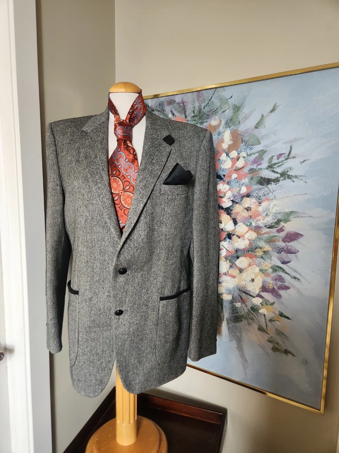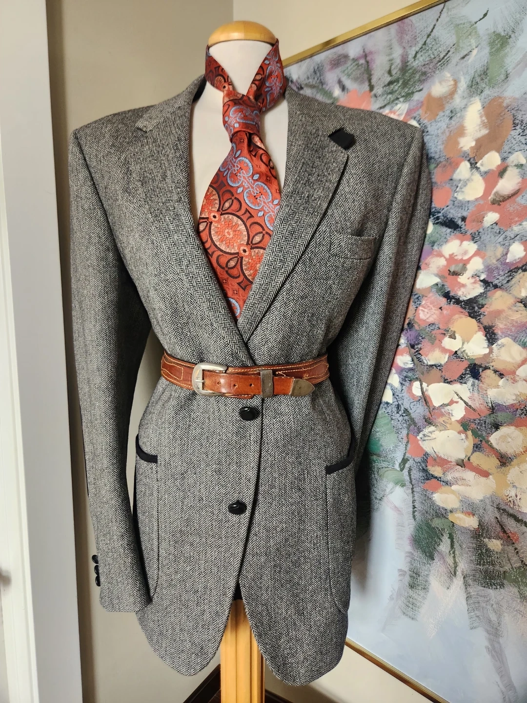 A stylish men's grey tweed blazer with a herringbone pattern. Features contrast trim on the pockets and elbow patches. Men's Blazer, but can be belted up and rocked by the ladies too! Two-button closure. Perfect for smart-casual occasions! And its drycleaned. 26 jacket length, 19 inch shoulder width, chest is 42 Inche diameter.