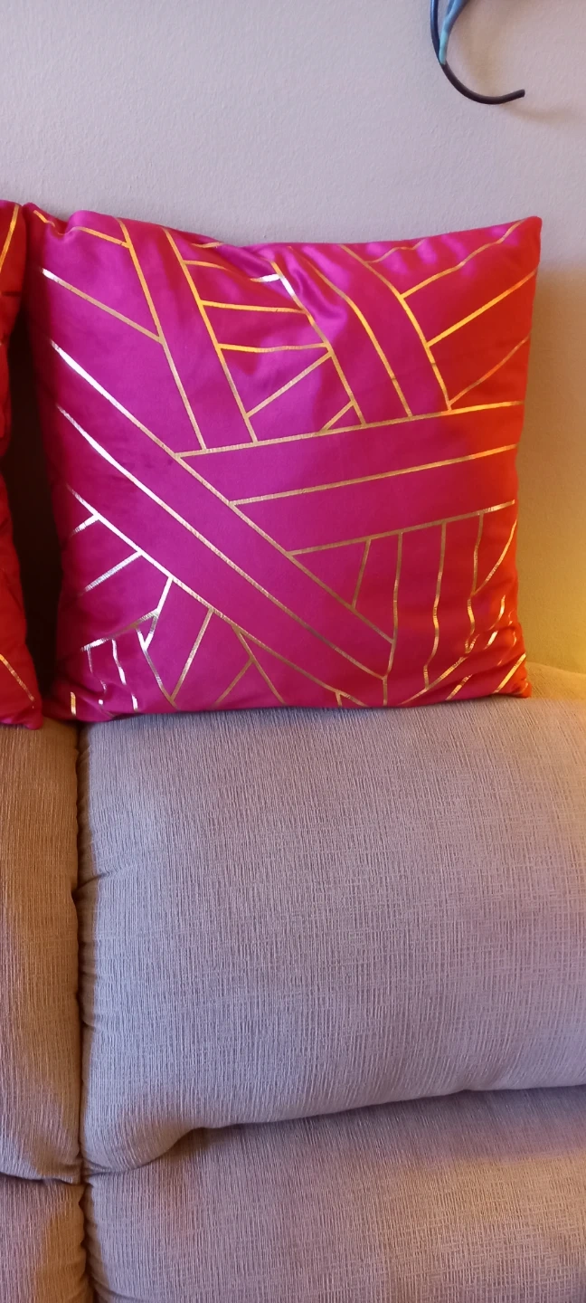 Add a pop of colour with this vibrant red decorative pillow. It features a stylish gold geometric line design. Its material appears to be a smooth, possibly satin-like fabric. New $8 for 2 of them