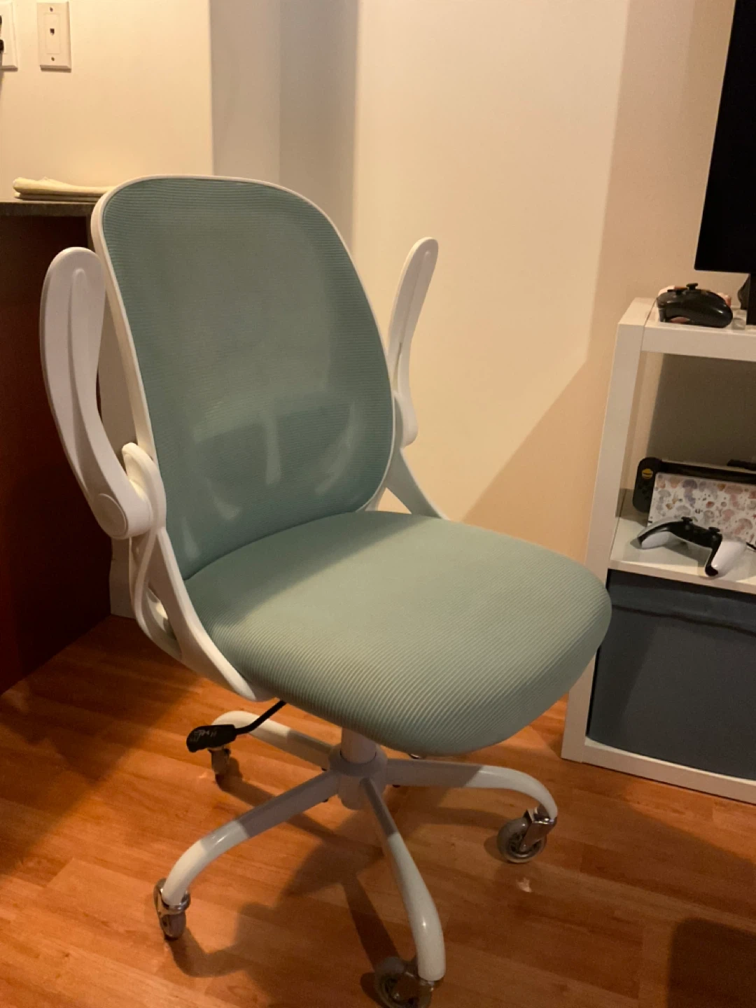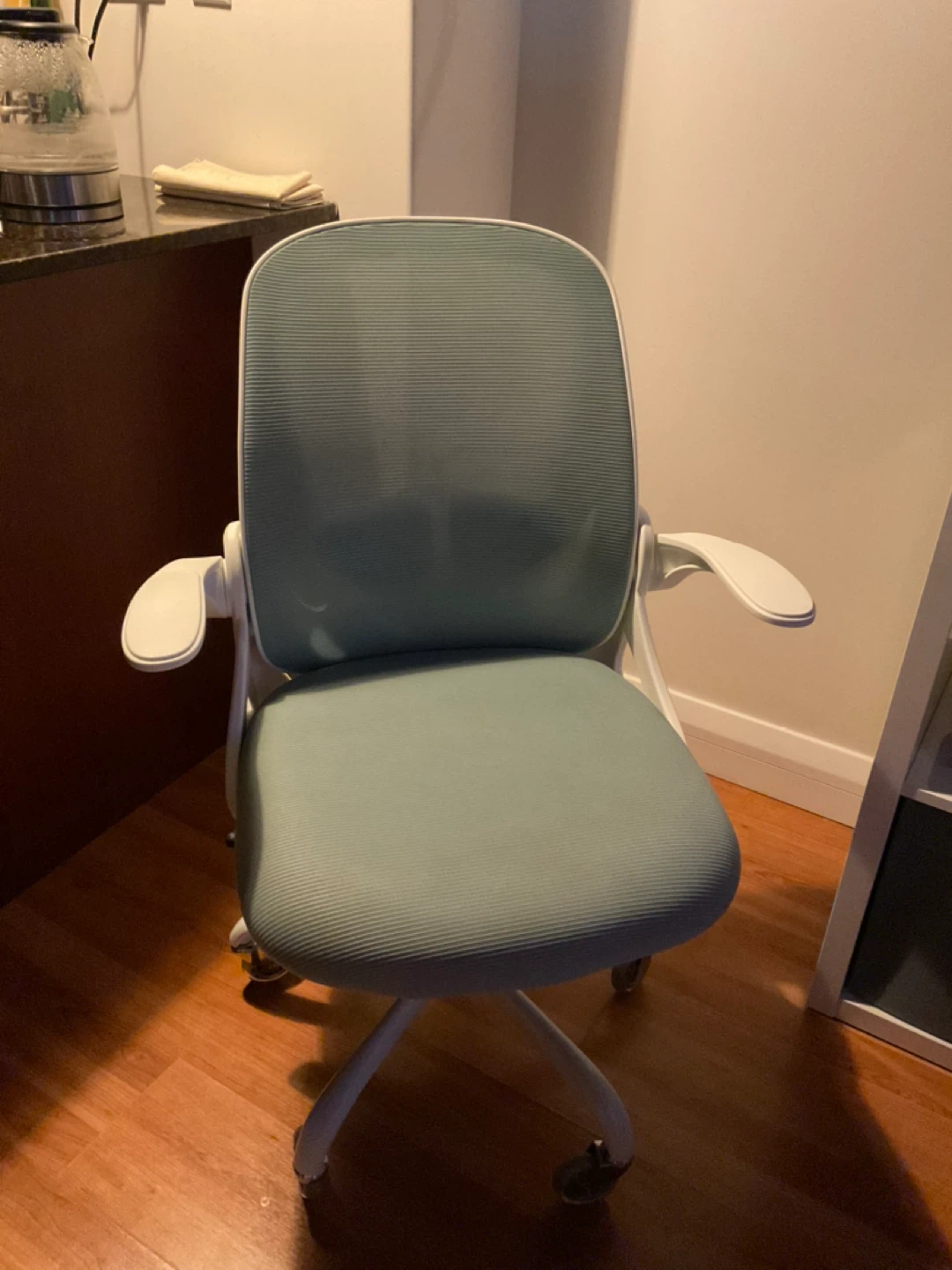 Light blue/green swivel chair with white accents.