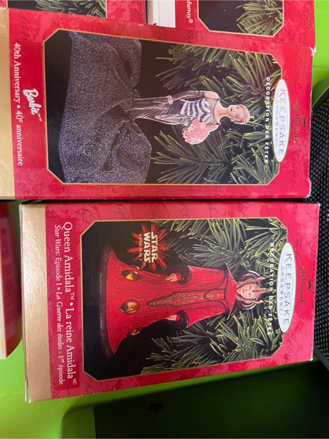 A collection of Hallmark Keepsake ornaments, including Barbie, Star Wars (Queen Amidala), Winnie the Pooh, and vehicles. Each comes in its original box.