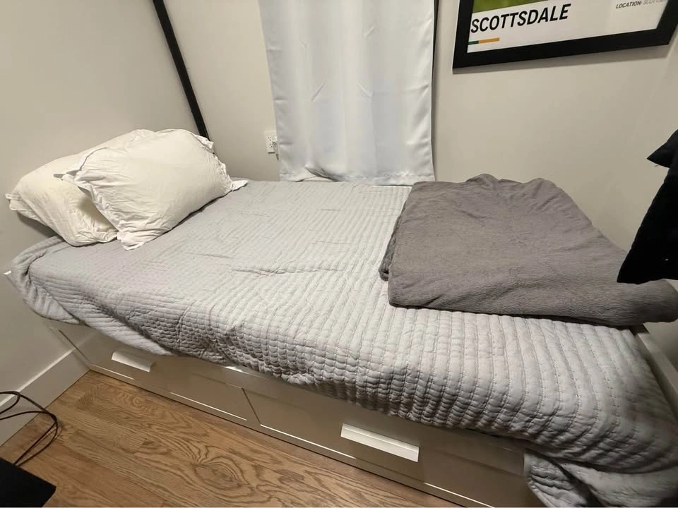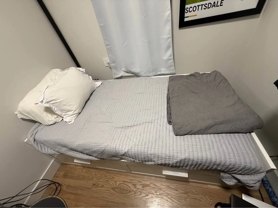 Perfect for a guest room, studio apartment, or kid’s room. This is a 3-in-1 setup: sofa by day, single bed at night, or pull out the base for a full double bed when guests stay over. Both VANNAREID pocket spring mattresses included. Two large storage drawers underneath for sheets, pillows, or whatever you need to hide away. White frame, minor wear consistent with normal use — nothing structural, looks great. Dimensions: 41” wide as sofa / 78” wide as double bed, 76” long. Buyer must disassemble and haul. I can help load. Pickup in East Village.