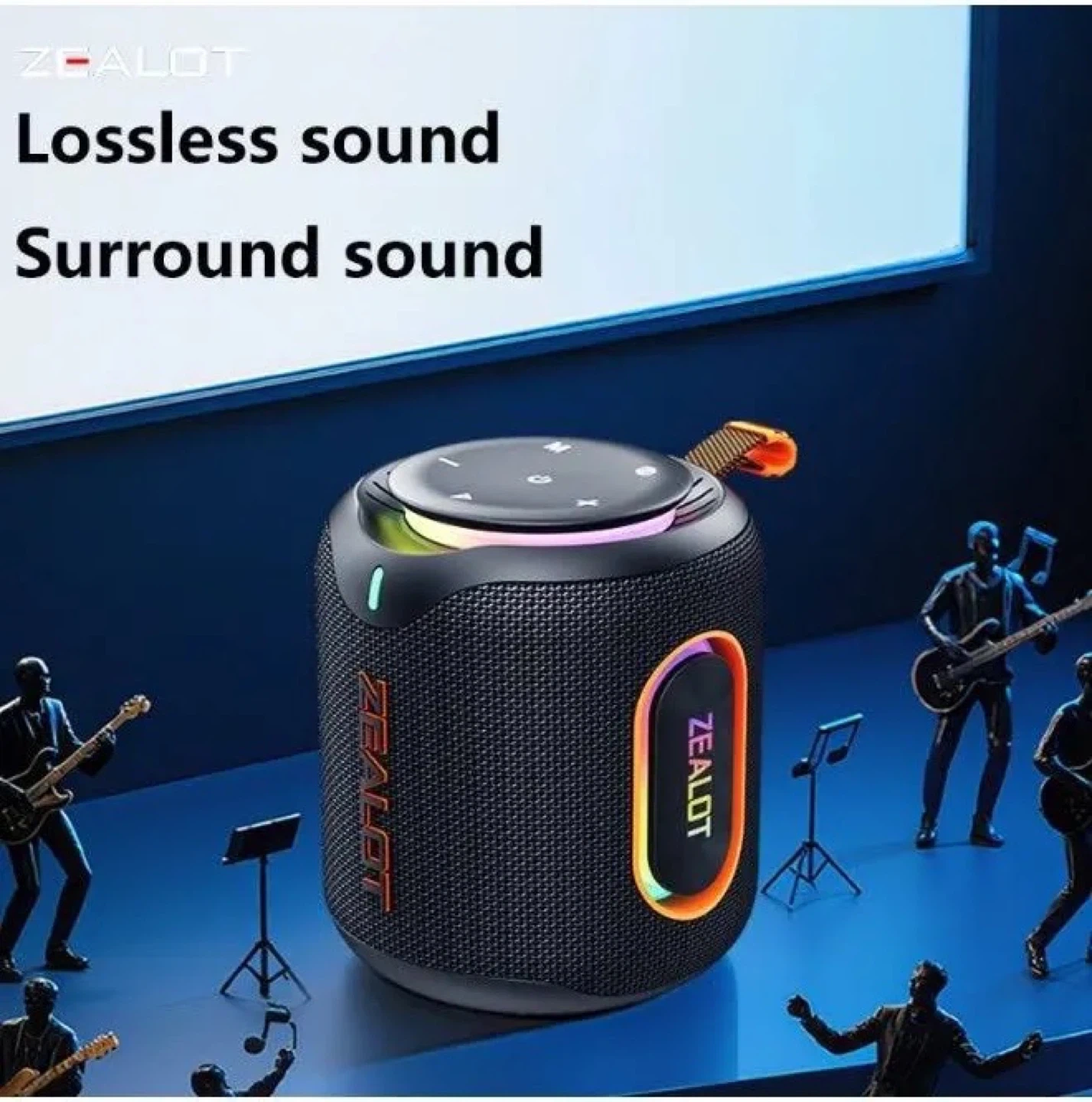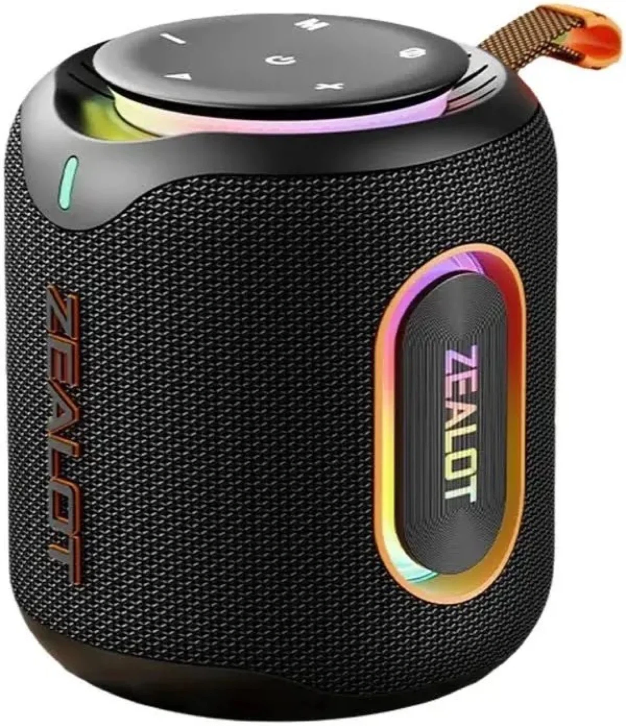 Portable Zealot Bluetooth speaker with LED accent lighting. It's 15.1 cm tall and 13 cm wide. This loud speaker offers surround sound.