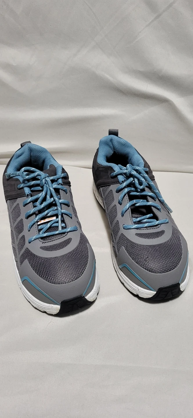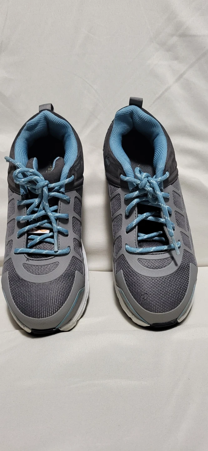 These Workload Jogger safety shoes are perfect for on-the-job protection! They are a ladies size 7. The shoes are grey with blue accents. The shoes feature a wide-fit composite toe and are metal-free. They are also lightweight for all-day comfort. Shoes are in great like a new condition. The original box is included!