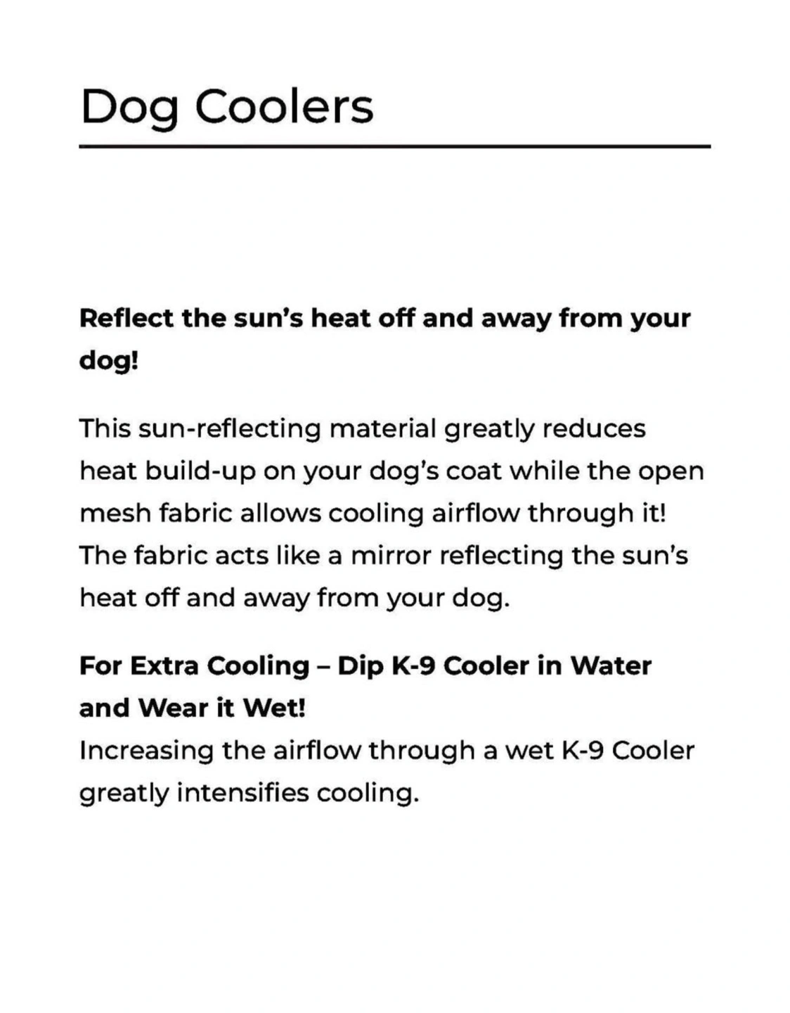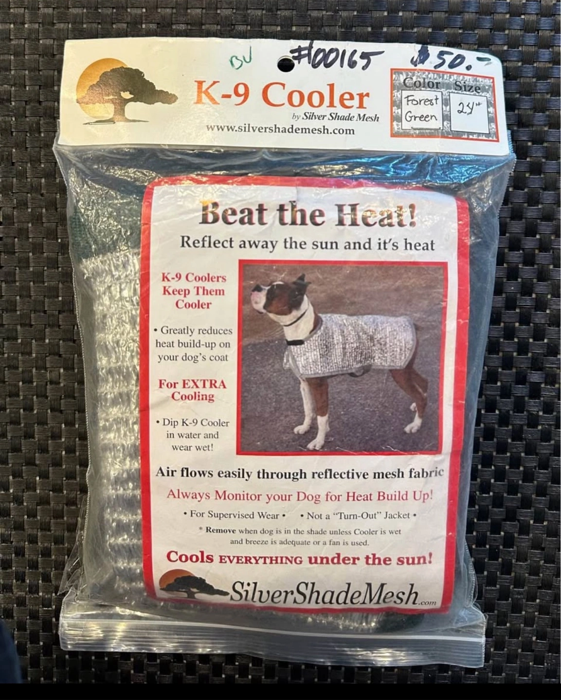 Have your precious companion “Beat the Heat” with this “Silver Shade” sun shield! • New/Never Used; Still in Original Package. • It is made of UV Ray protected poly-aluminum fabric that was developed and patented in Israel to overcome the harmful effects of the sun and temperature variations. • Unlike other shade materials that absorb the sun’s radiation and become hot, “Silver Shade” reflects the rays back into the atmosphere. • To enhance its already superior job of cooling your pet, for extra cooling, the K-9 Cooler can be dipped into water, and worn wet. • It is light weight, yet very durable. The open weave fabric allows fresh air circulation and it will not run, tear or unravel. • Size: 24"