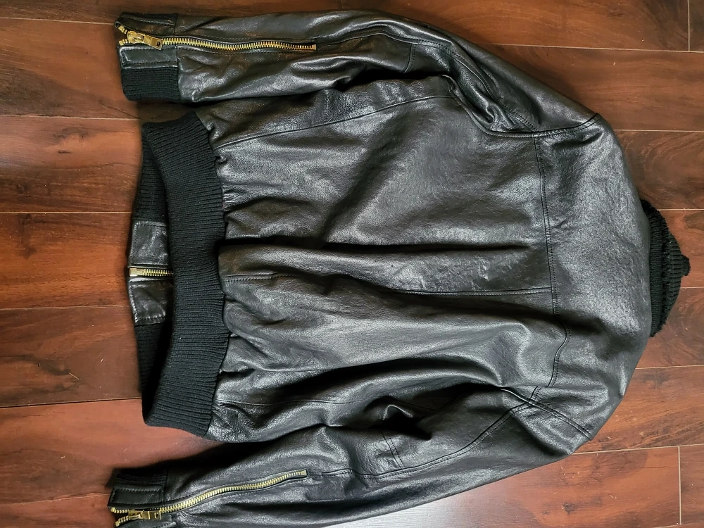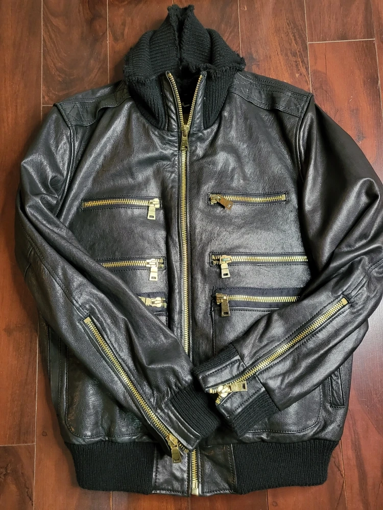 21Selling a XL stylish K & C leather jacket in black. It features a unique design with multiple zippers and a comfortable knitted collar and cuffs. The jacket has a quilted lining, making it a great addition to your wardrobe!