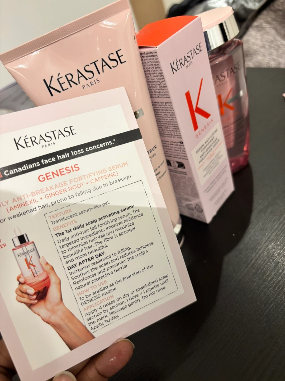 15Got as gift from Sephora. Retail over 130. Gift box came damaged Selling Kérastase Genesis Anti-Breakage Fortifying Serum. This serum is designed to help with hair loss concerns, specifically for weakened hair prone to falling due to breakage. It contains Aminexil and Ginger Root + Caffeine. It's a translucent serum-like gel that you apply daily to the scalp to improve resistance and minimize hair fall. Increases resilience to falling and soothes the scalp and reduces itchiness