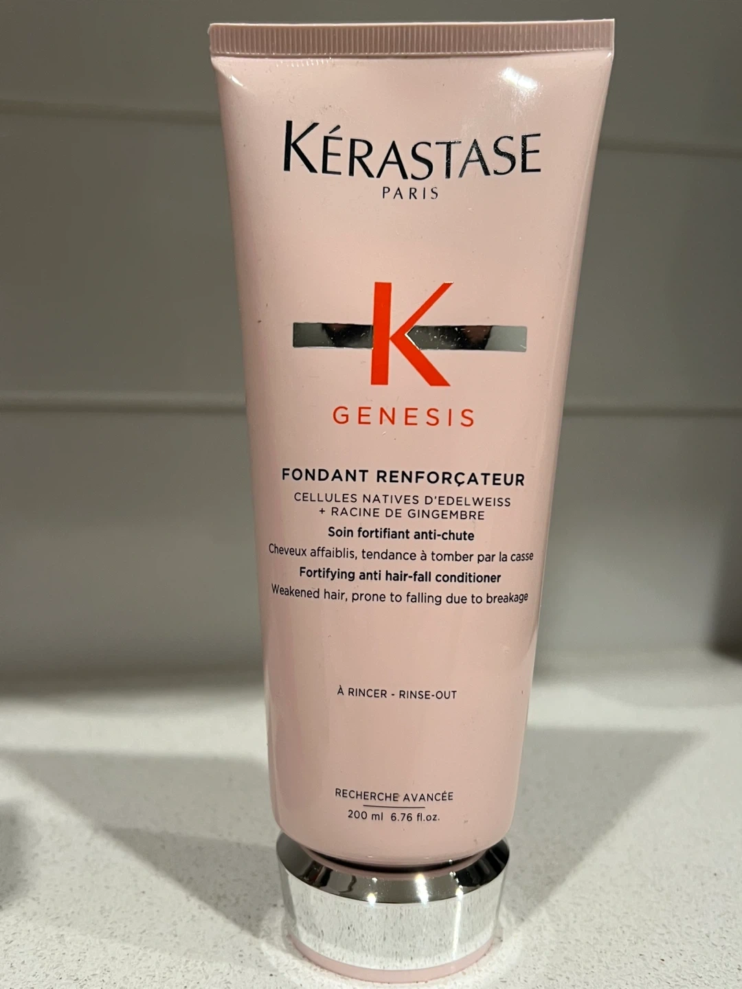 10Selling a bottle of Kérastase Genesis Fondant Renforçateur, a fortifying anti-hair fall conditioner! It contains native cells of edelweiss and ginger root, designed for weakened hair prone to breakage. It's a rinse-out conditioner and contains 200ml (6.76 fl.oz.)