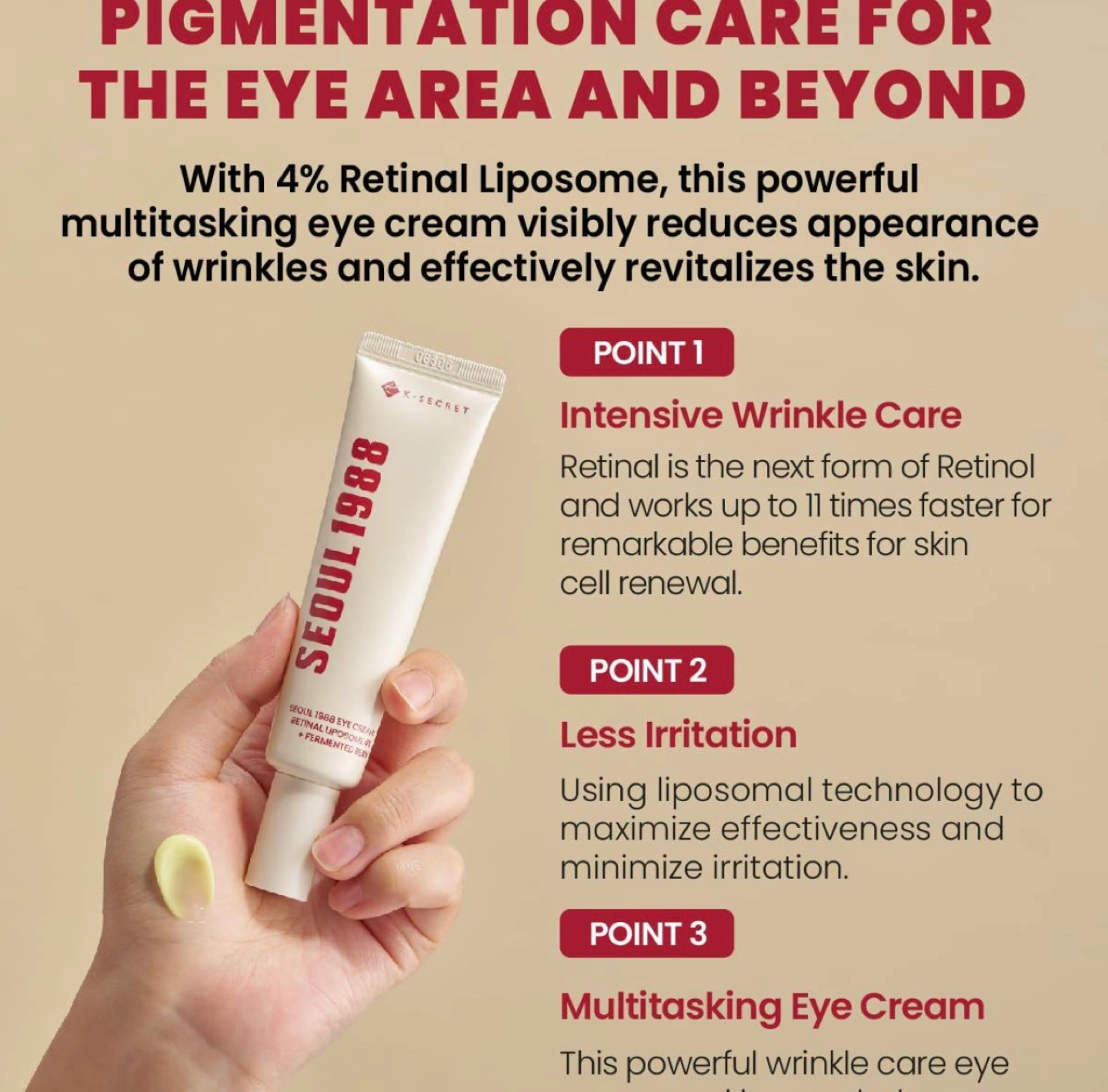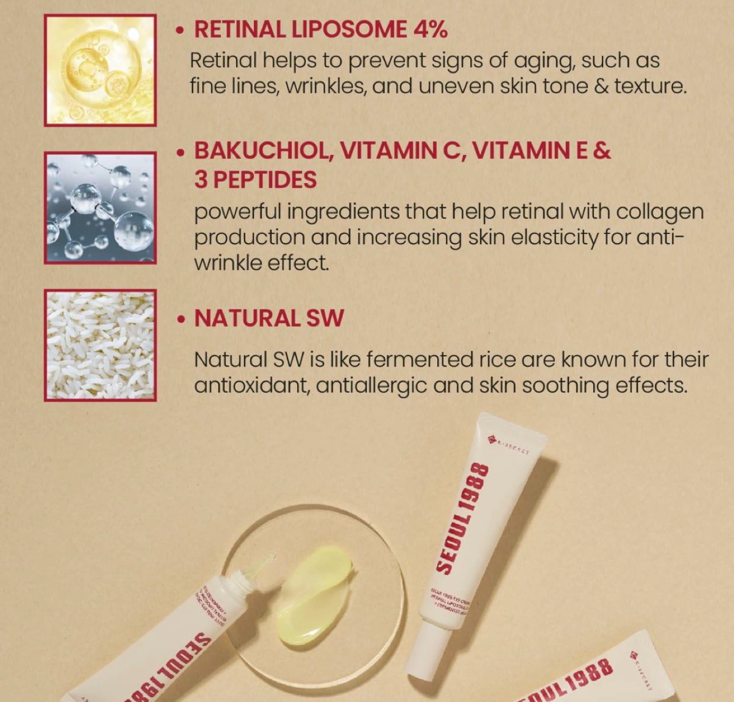 96Selling a K-Secret Seoul 1988 Eye Cream! It contains retinal liposome 4% and fermented bean to help with anti-aging, intensive eye zone care, brightening, and improving skin texture. It's specially recommended for aging and mature skin and helps to prevent signs of aging, such as fine lines, wrinkles, and uneven skin tone & texture