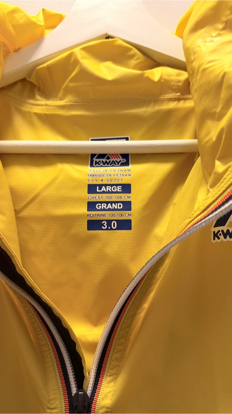 Selling a bright yellow K-Way Le Vrai 3.0 rain jacket in a size large. It's in great condition and perfect for those rainy days! The jacket is lightweight and easy to pack, making it ideal for travel or just keeping in your bag for unexpected showers