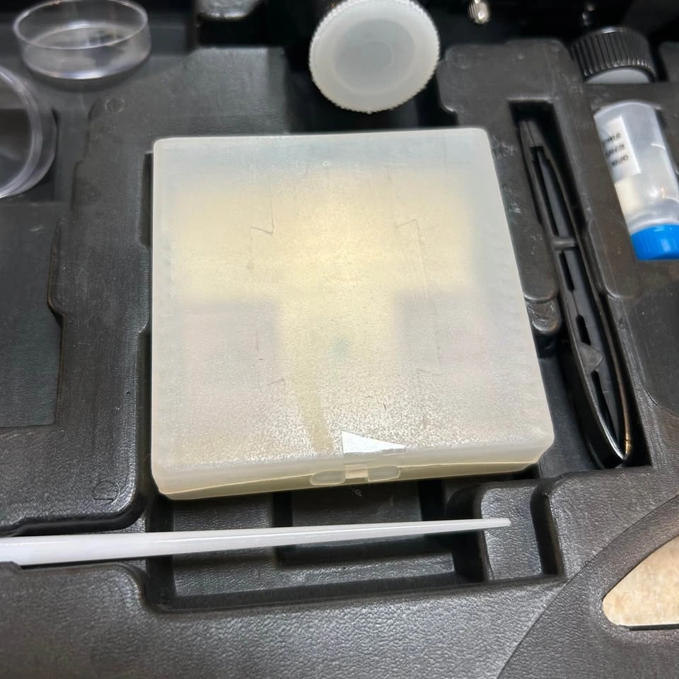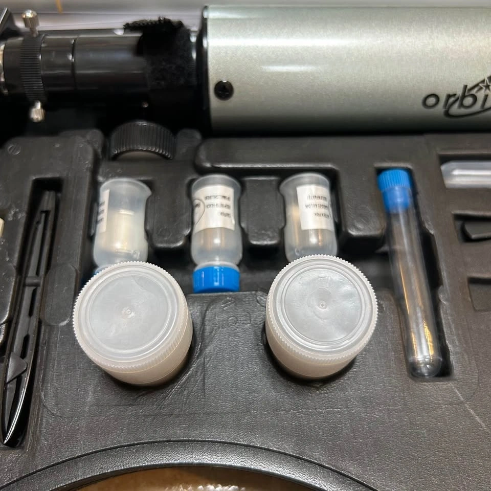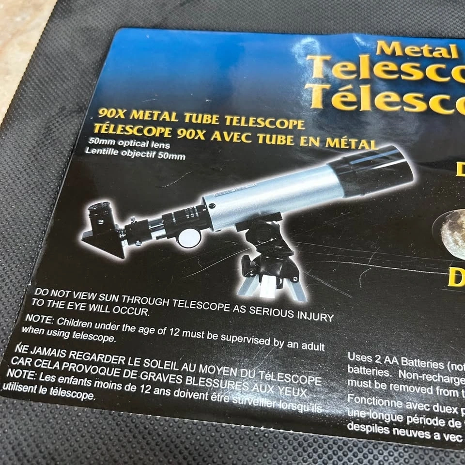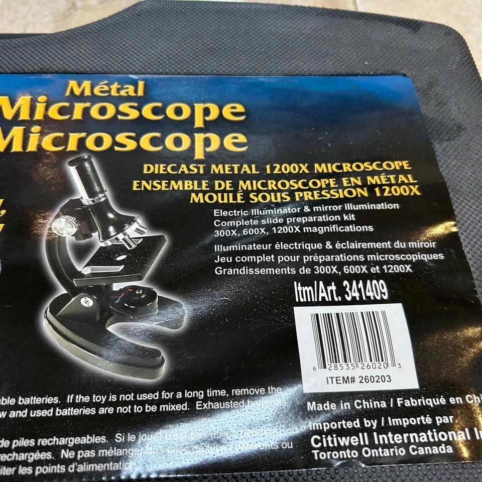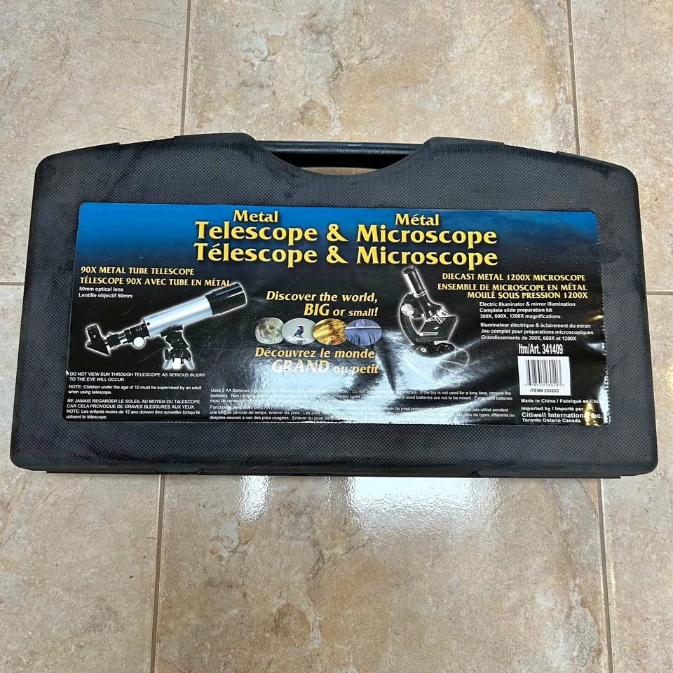 Barely used metal telescope and microscope kit. Diecast metal 1200x microscope with electric illuminator, mirror illumination and complete slide preparation kit with 300x, 600x and 1200x magnifications. 90x metal tube telescope with 50mm optical lens.