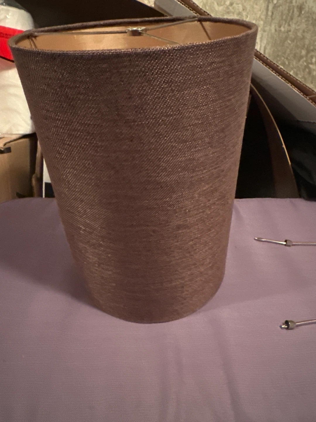 This is a brown fabric lampshade with a burlap-like texture. It's a tapered drum shape and has a classic look. It's 10 inches by 10 the top by 14 inches tall