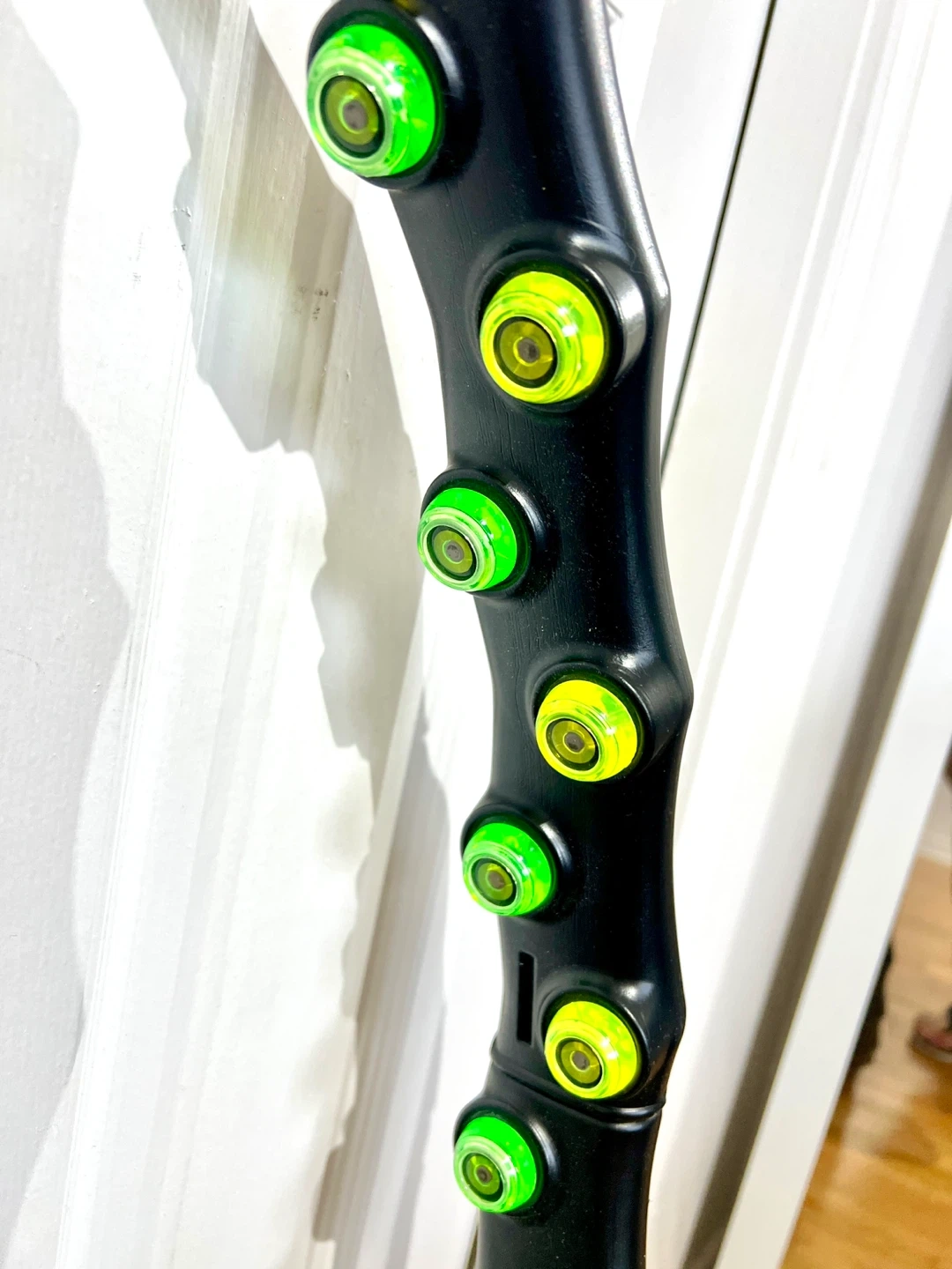 This is an adjustable fitness hula hoop with weighted massage balls. It's designed for core workouts and can be assembled in different sizes. The hoop is black with green and yellow massage nubs.