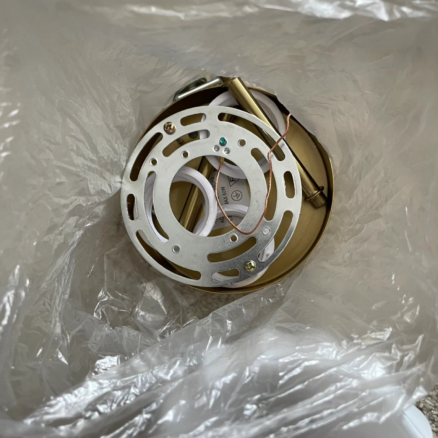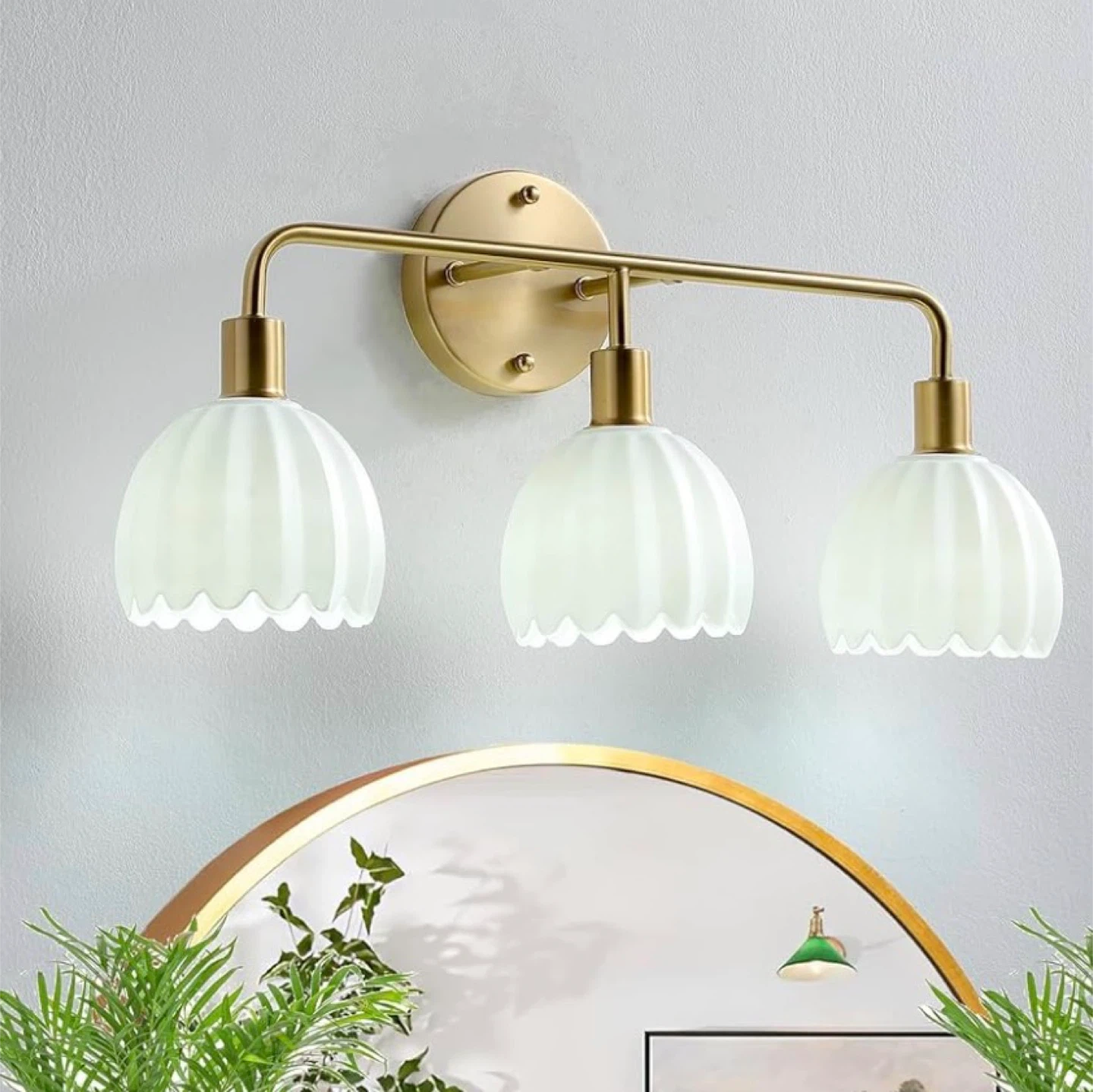 This vanity light fixture features three white glass shades with a gold finish base. It includes all necessary mounting hardware for installation. It's suitable for bathrooms or hallways.