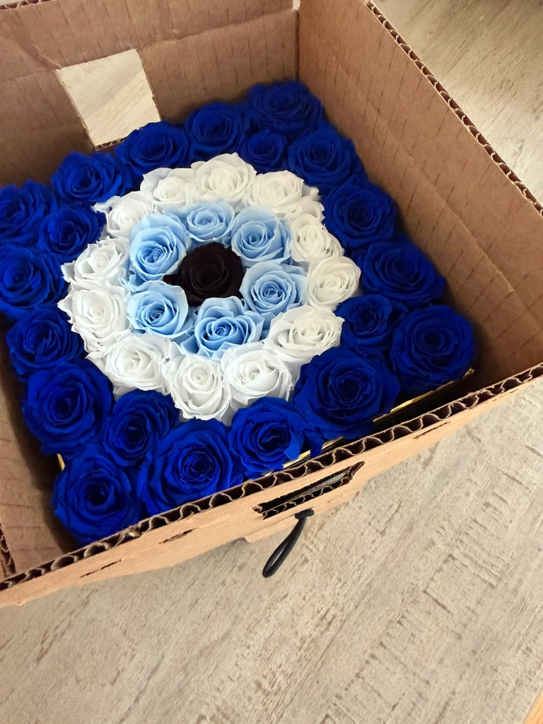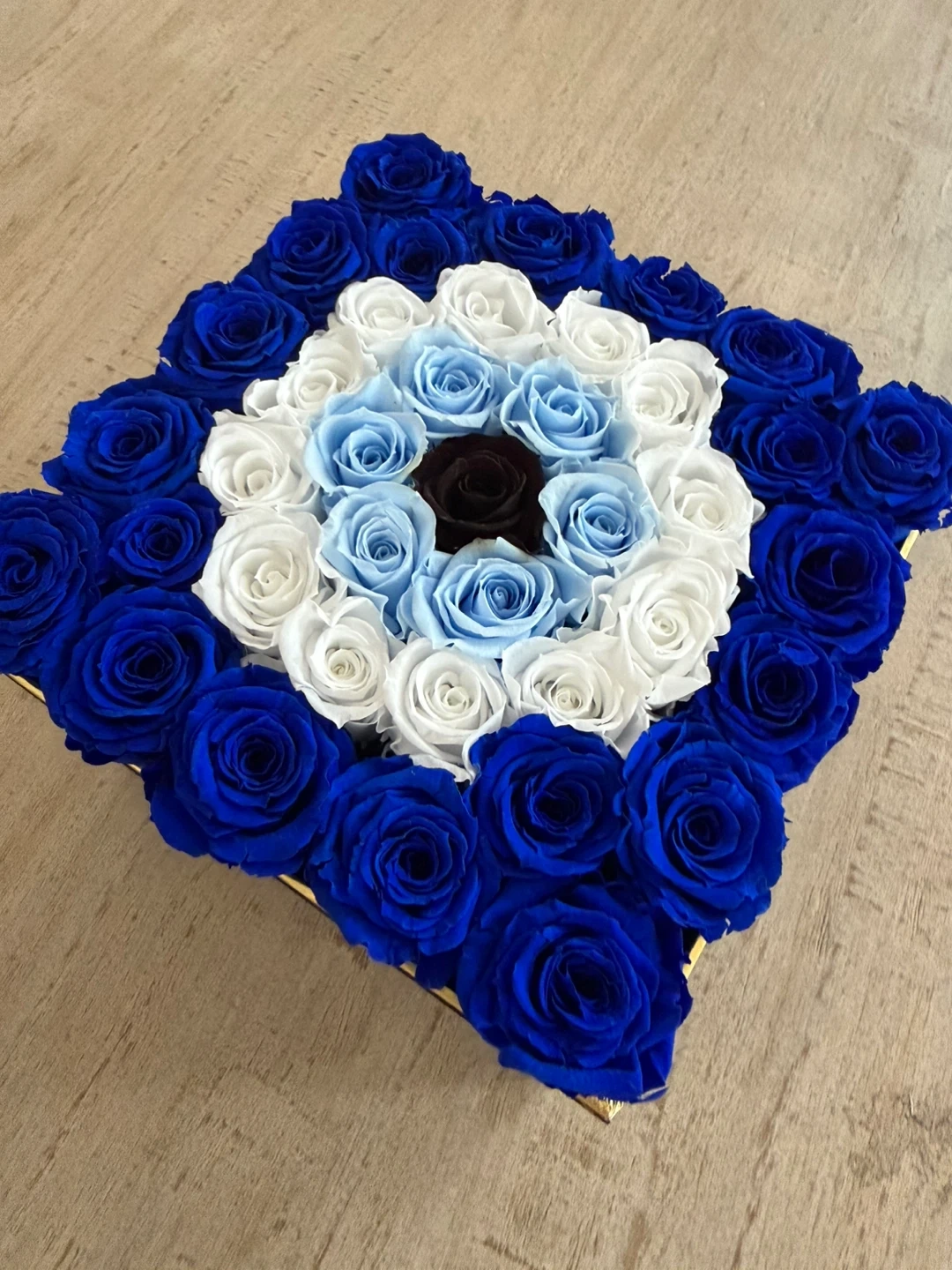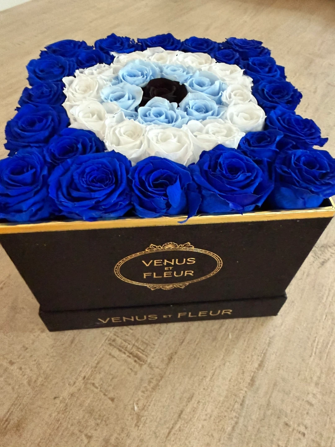 A beautiful arrangement of preserved roses from Venus et Fleur, designed in an eye shape. It features deep blue, light blue, and white roses with a dark center. These preserved flowers are known to last for a year or more with proper care. It comes in its original black velvet box.