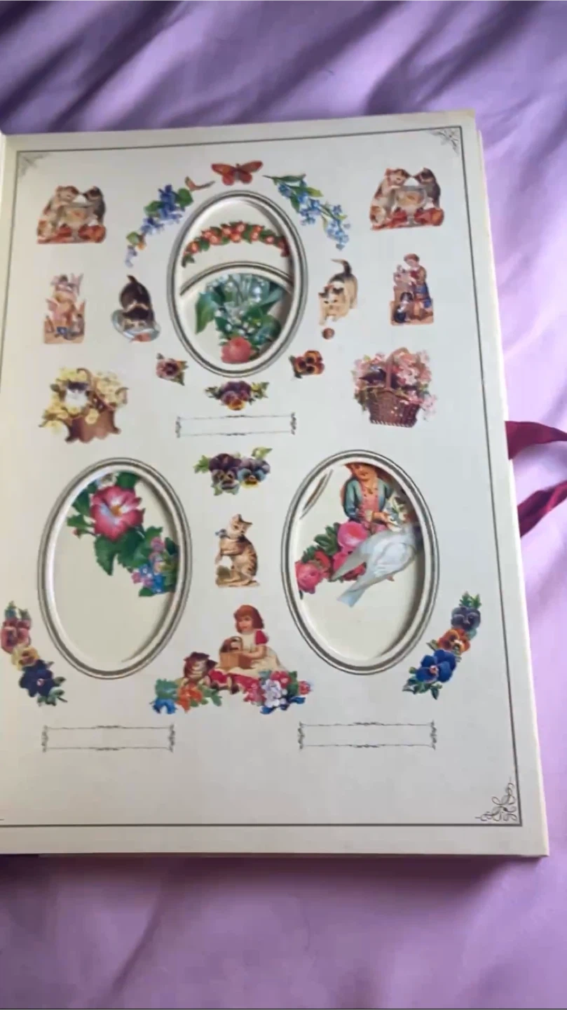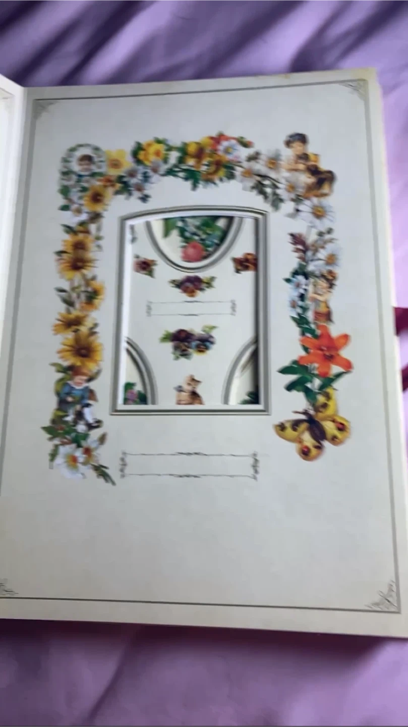 A beautiful Victorian-themed photograph album. It features charming cherub and floral designs throughout. This album is perfect for preserving your cherished memories! (Karrot doesn’t like videos so I took screenshots from the video of inside the book)
