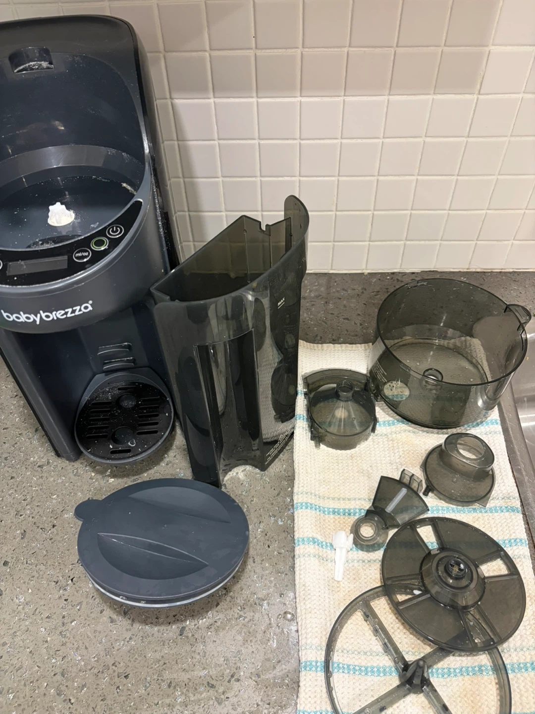 This Baby Brezza Formula Pro Advanced is a baby formula dispenser. It's designed to quickly and easily prepare formula bottles. Includes various parts for operation and cleaning.