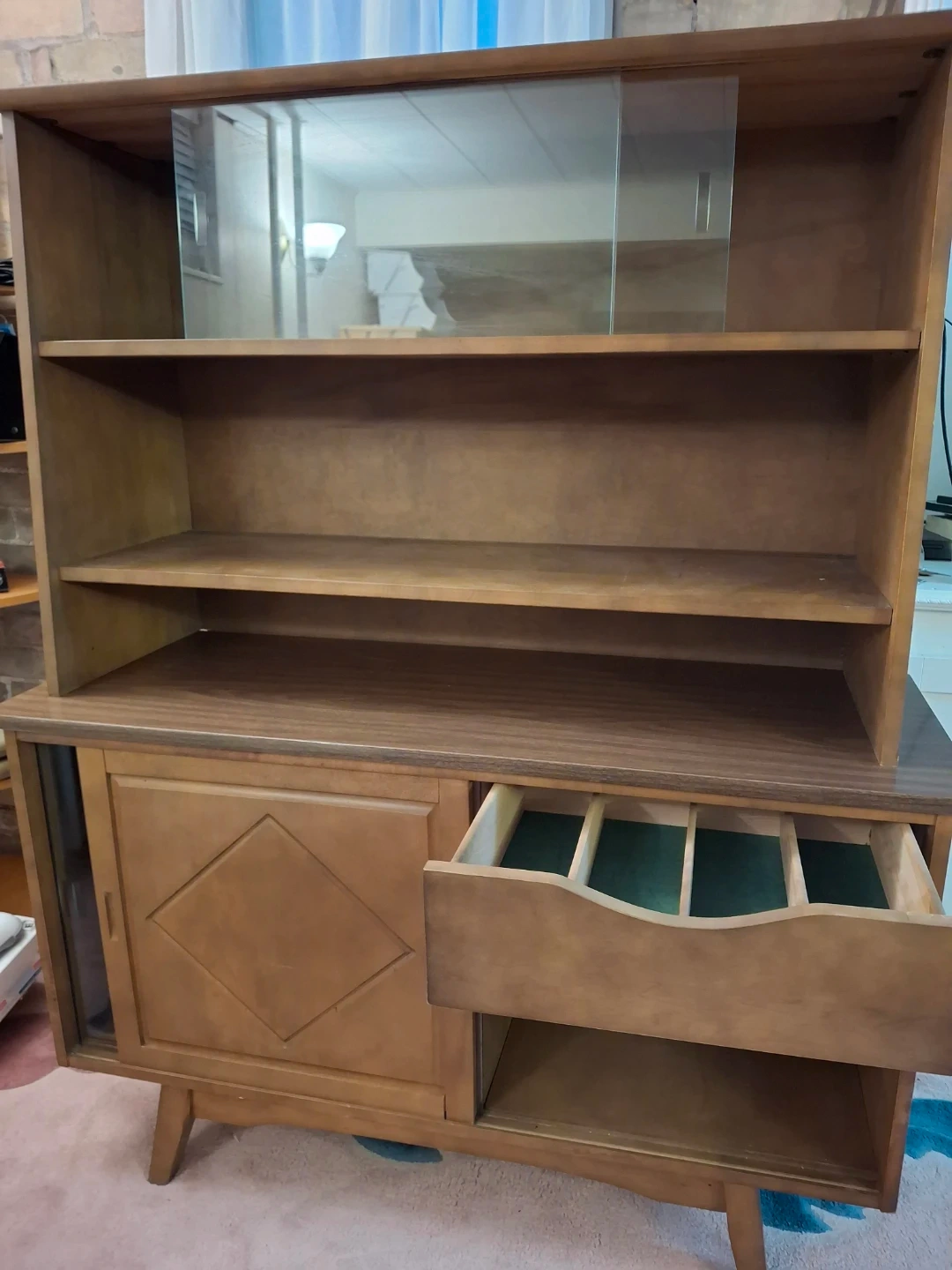 This hutch features a wooden frame with a mid-century modern design. It has two glass sliding doors on the top section and two shelves. The bottom section includes a sliding glass door on the left and a diamond-patterned cabinet door on the right, with a built-in drawer with dividers. It is 58 inches tall, 47 inches wide and 17 inches deep. The top section can be easily removed which makes transportation easy. Solid wood!