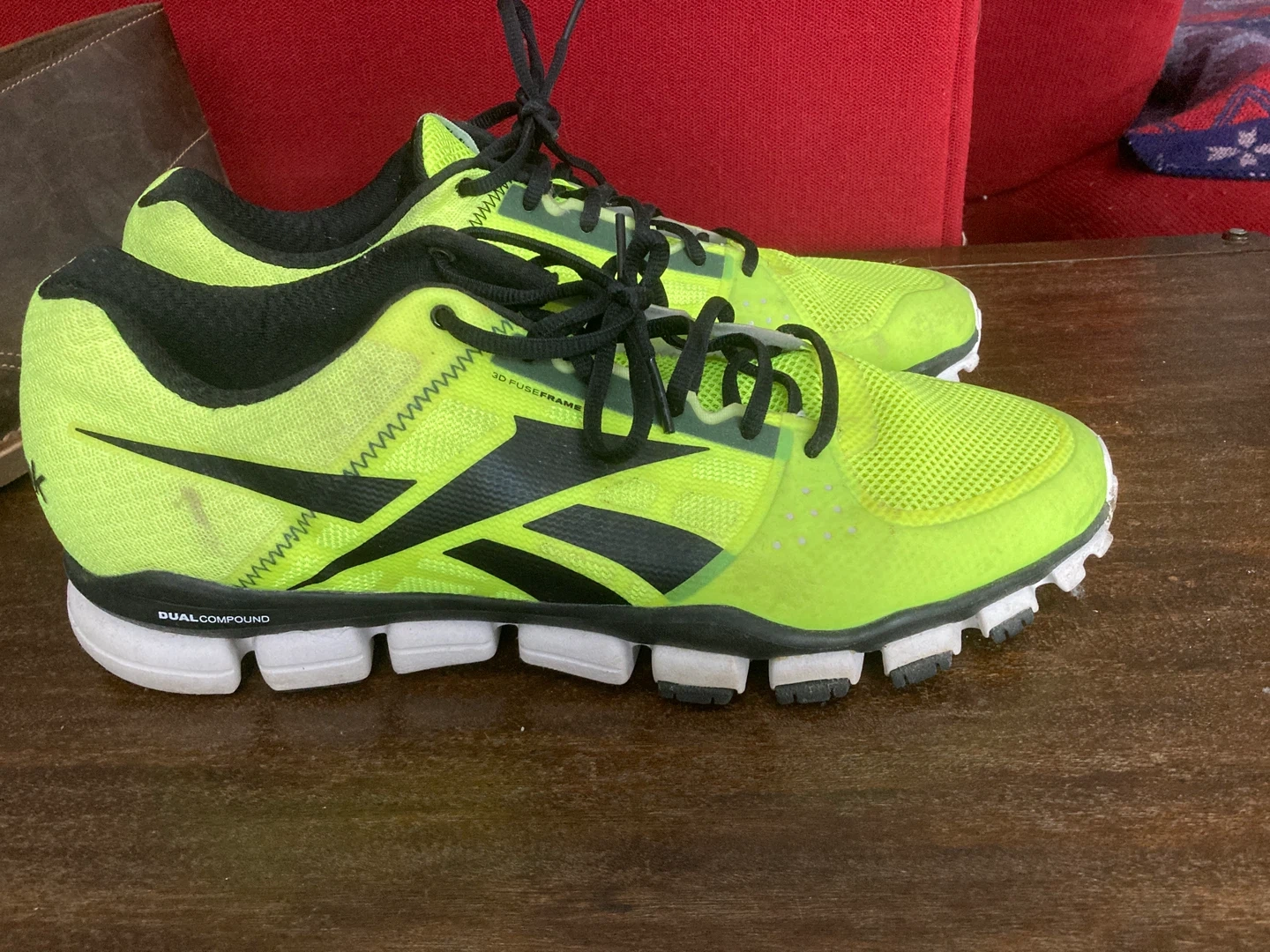 These Reebok running shoes are a bright neon colour. They feature a black Reebok logo and black laces. The soles are dual compound. Perfect for hitting the pavement or the gym!
