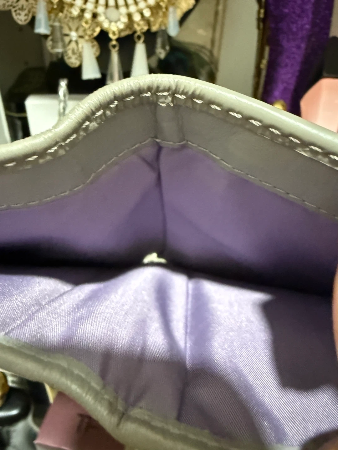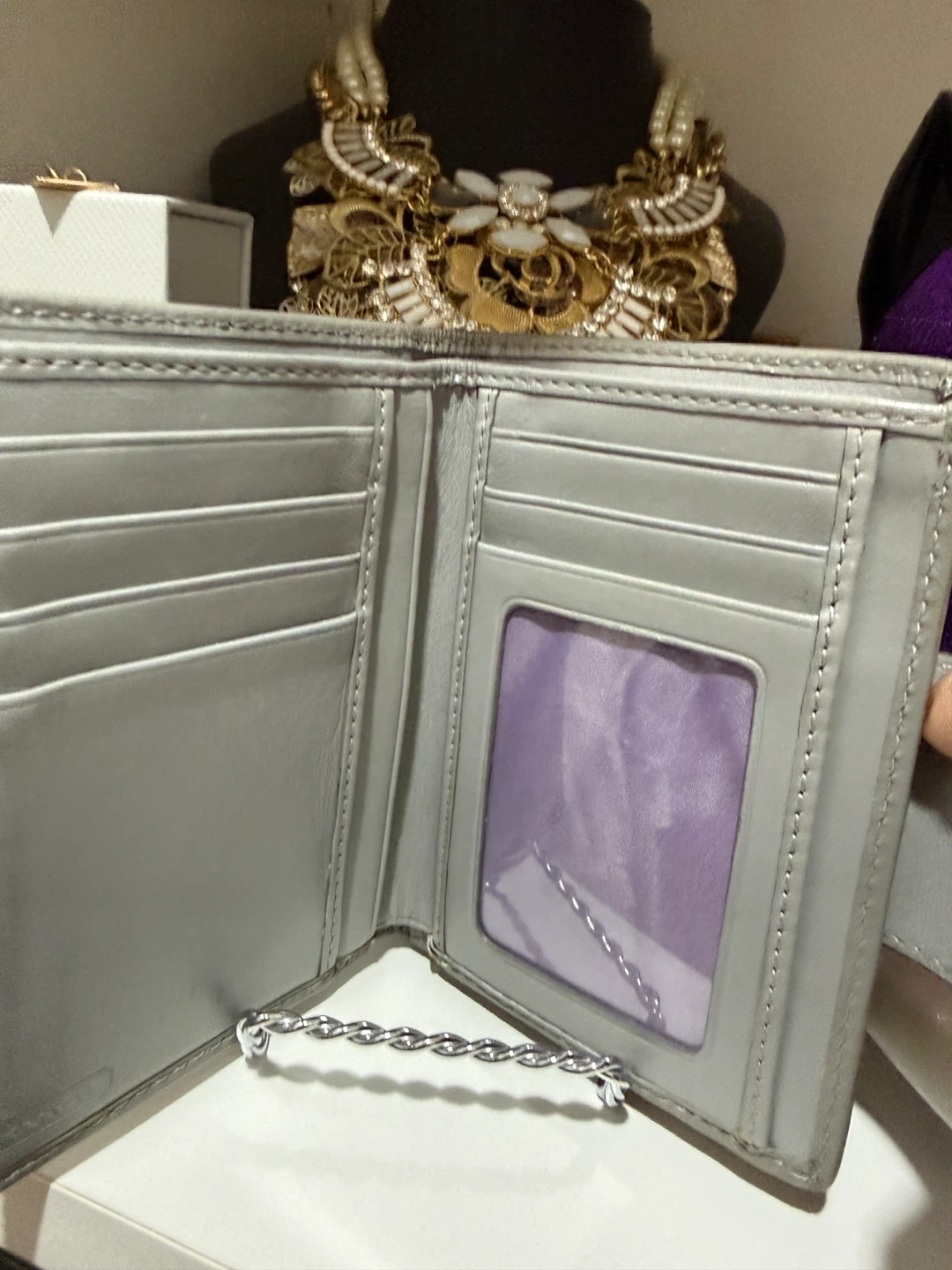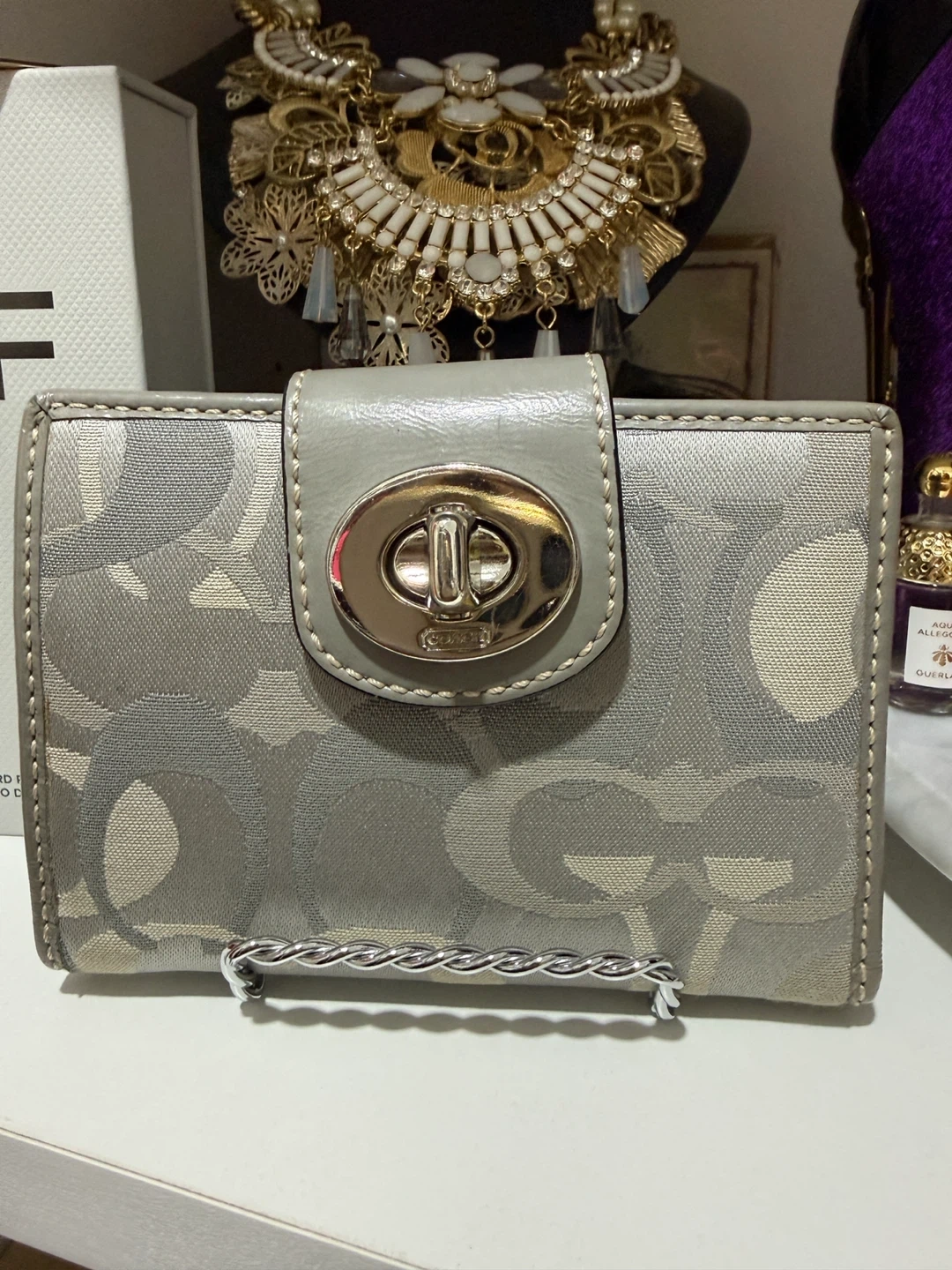 Grey and silver Coach trifold wallet with signature "C" pattern. It features a snap closure and a zippered coin pocket. Multiple card slots and an ID window inside.