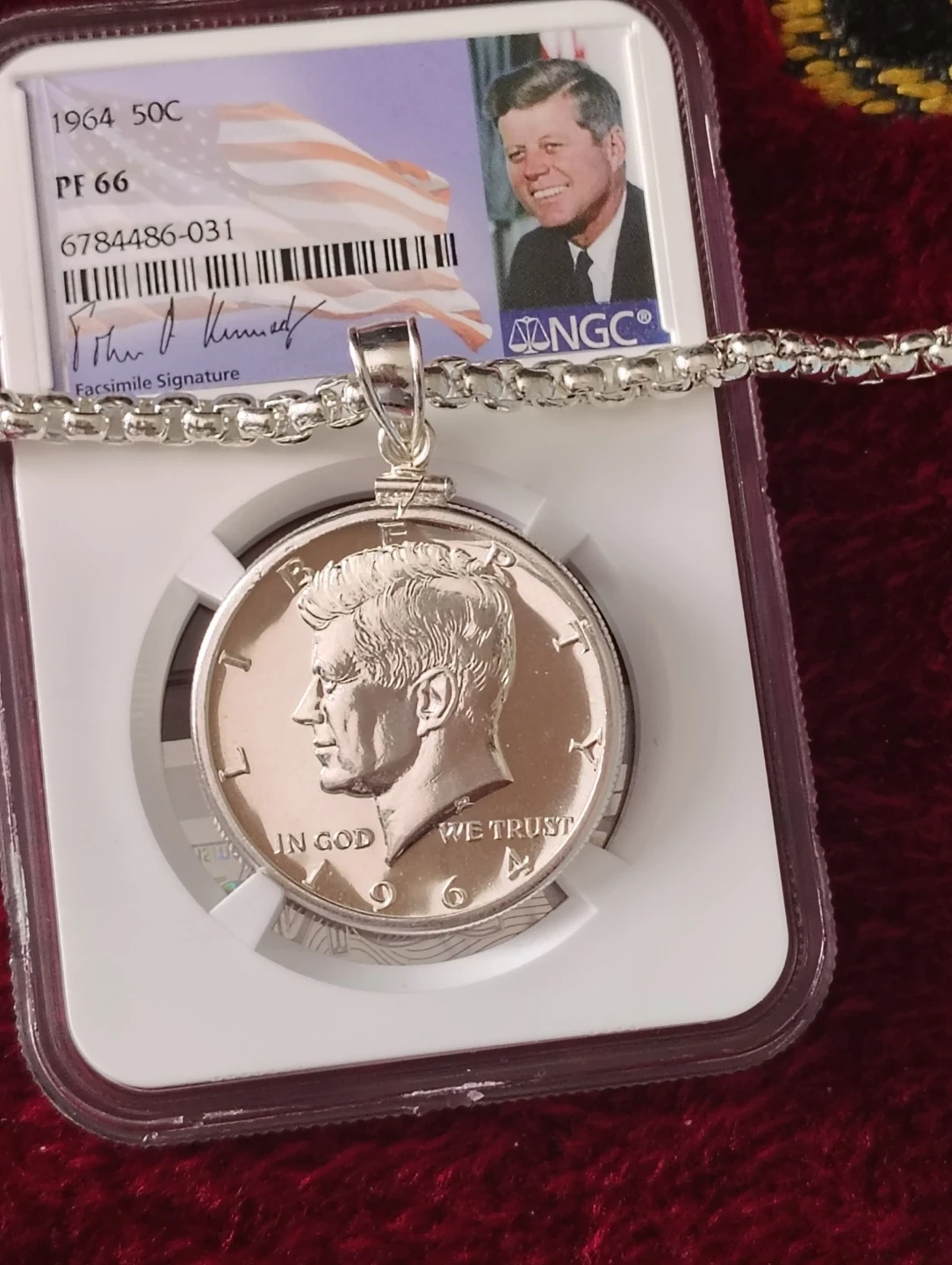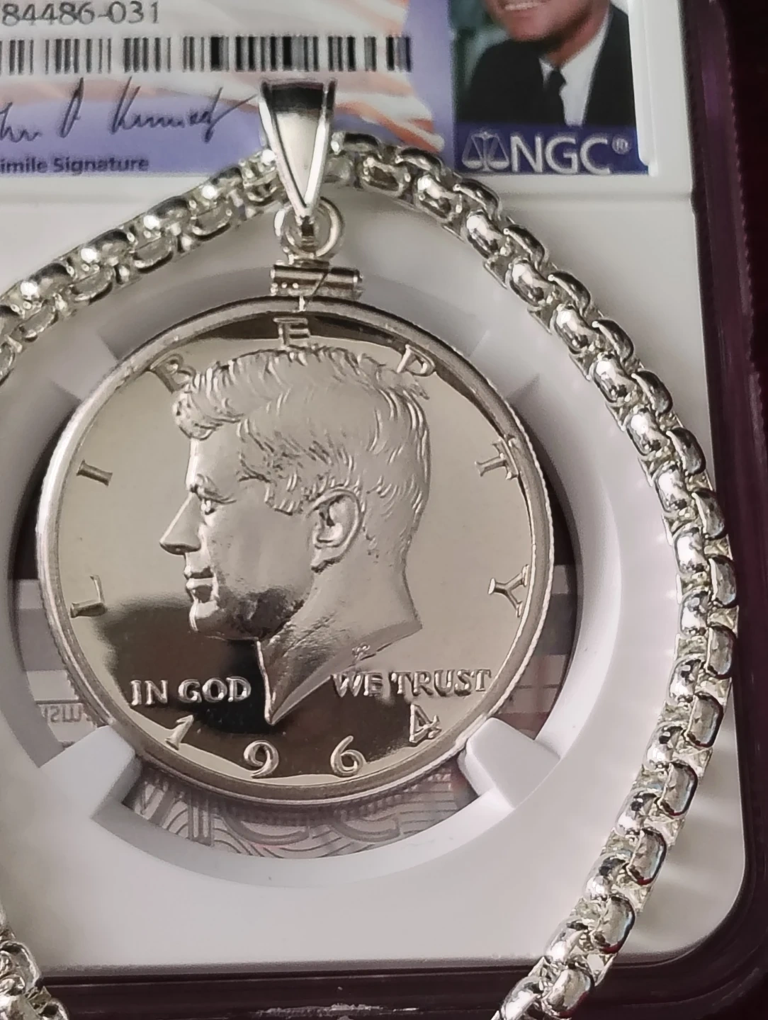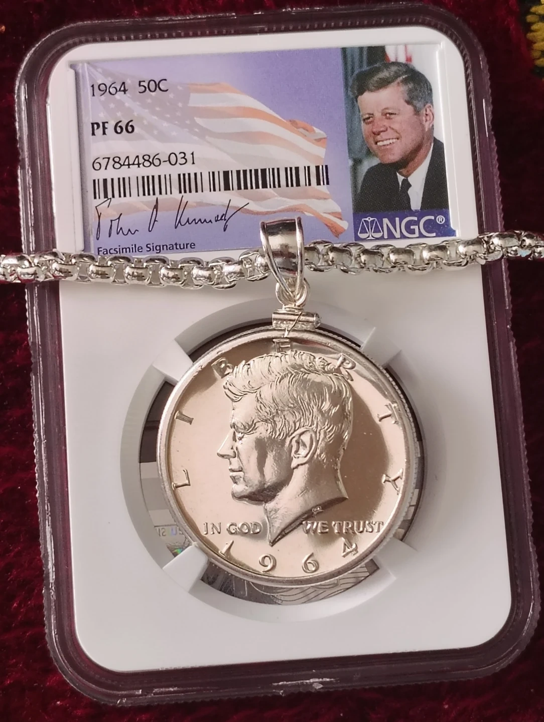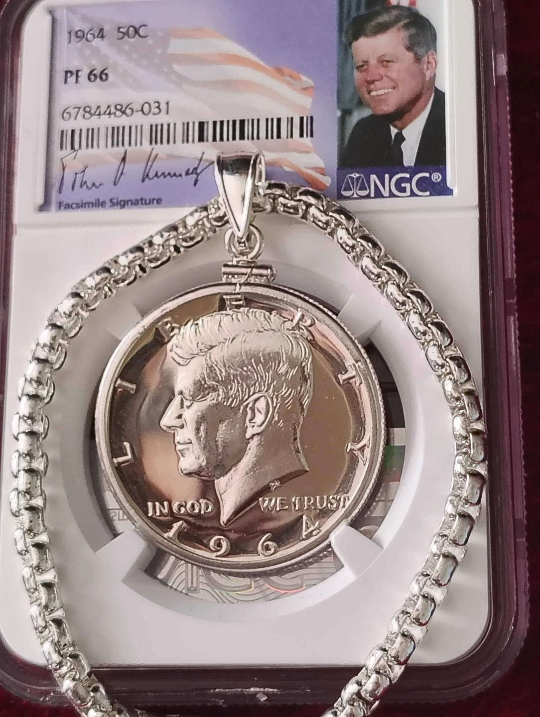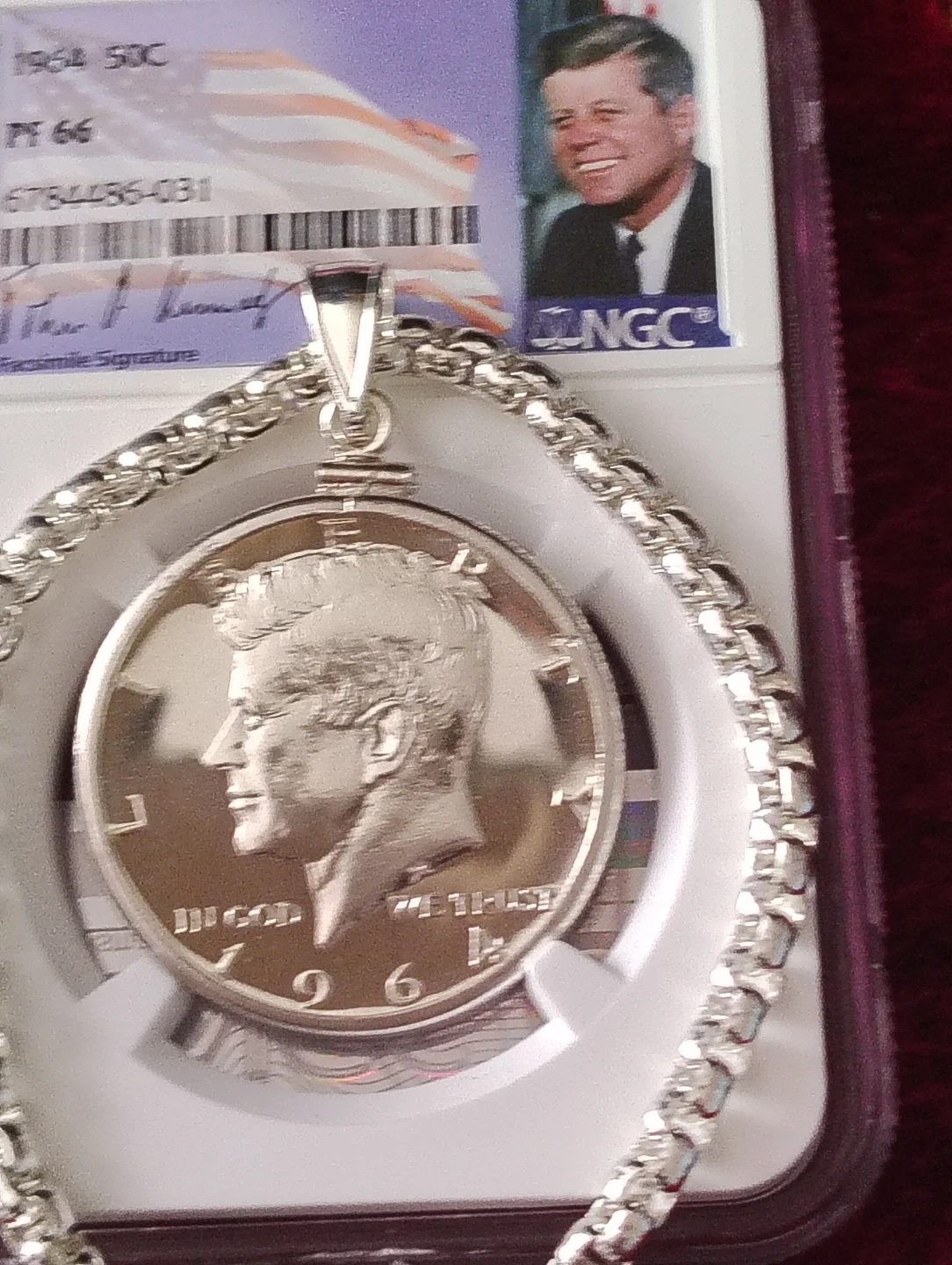 1964 Kennedy Half Dollar PF 66 Coin Pendant with Chain
