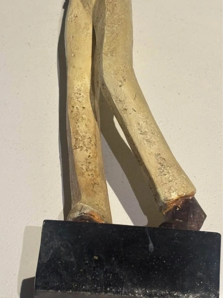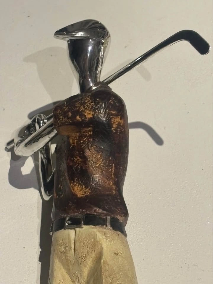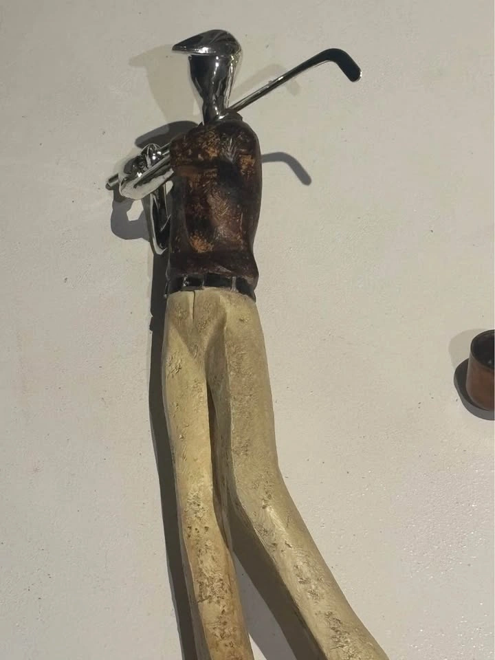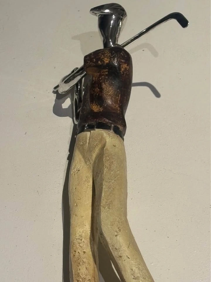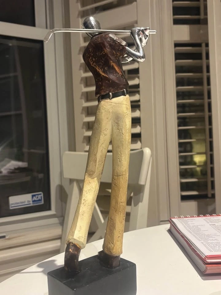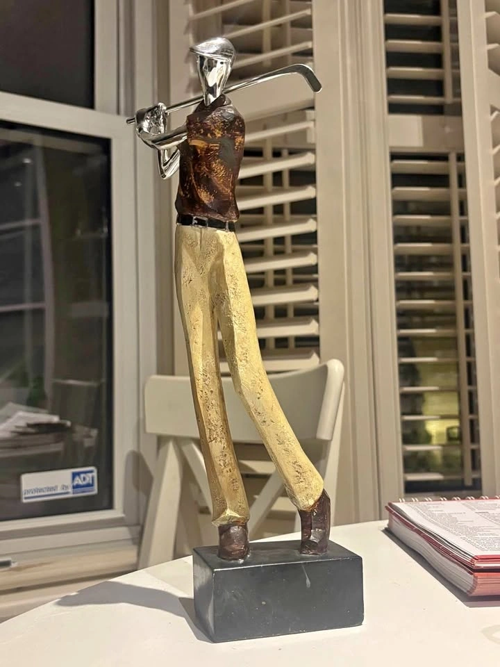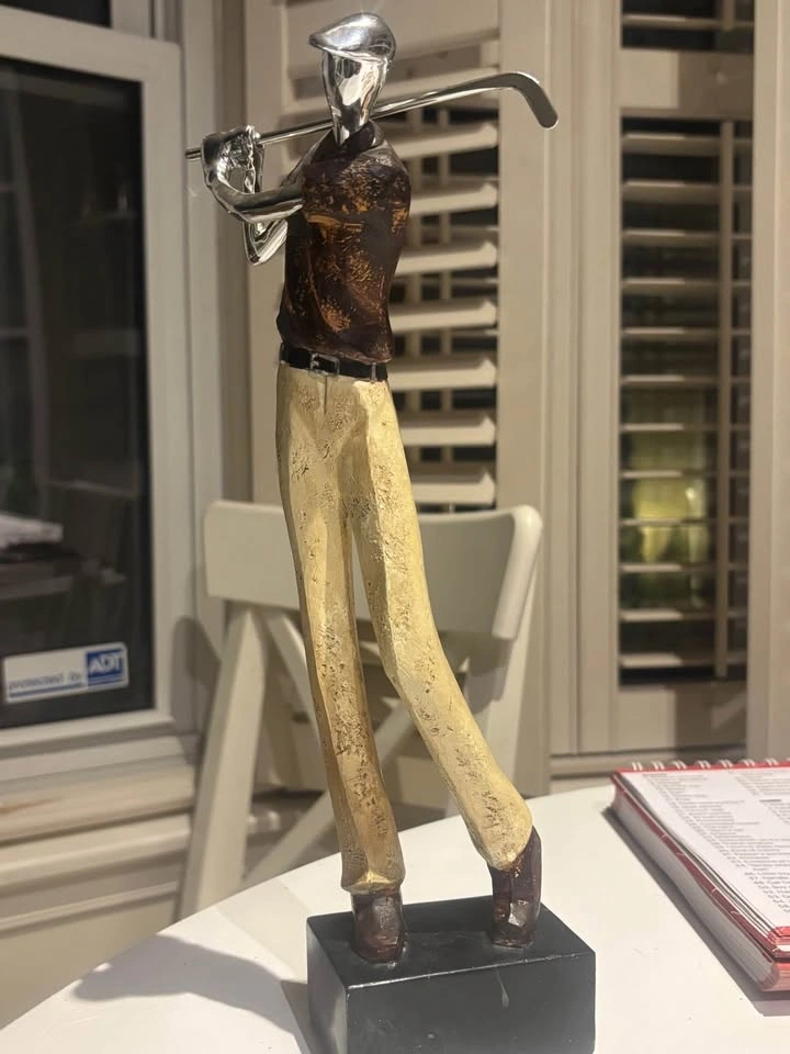 Unique golf player figurine in a swing pose. Features a silver head and arms, brown shirt, and light beige pants. Stands on a dark rectangular base. Great for home or office decor.
