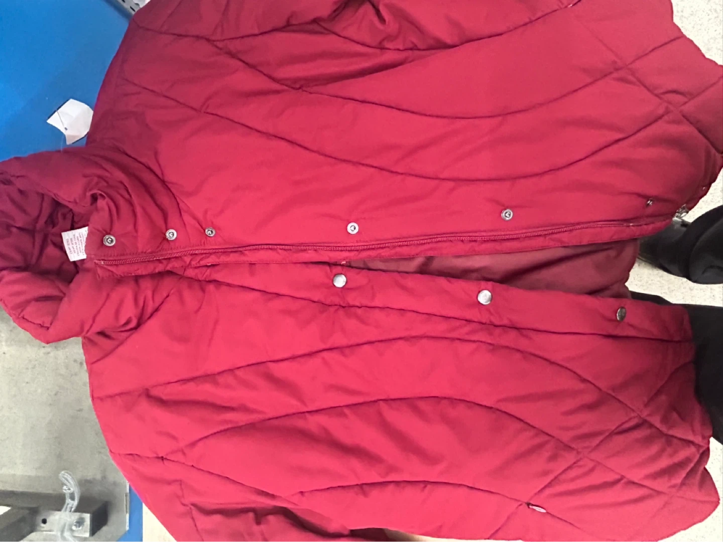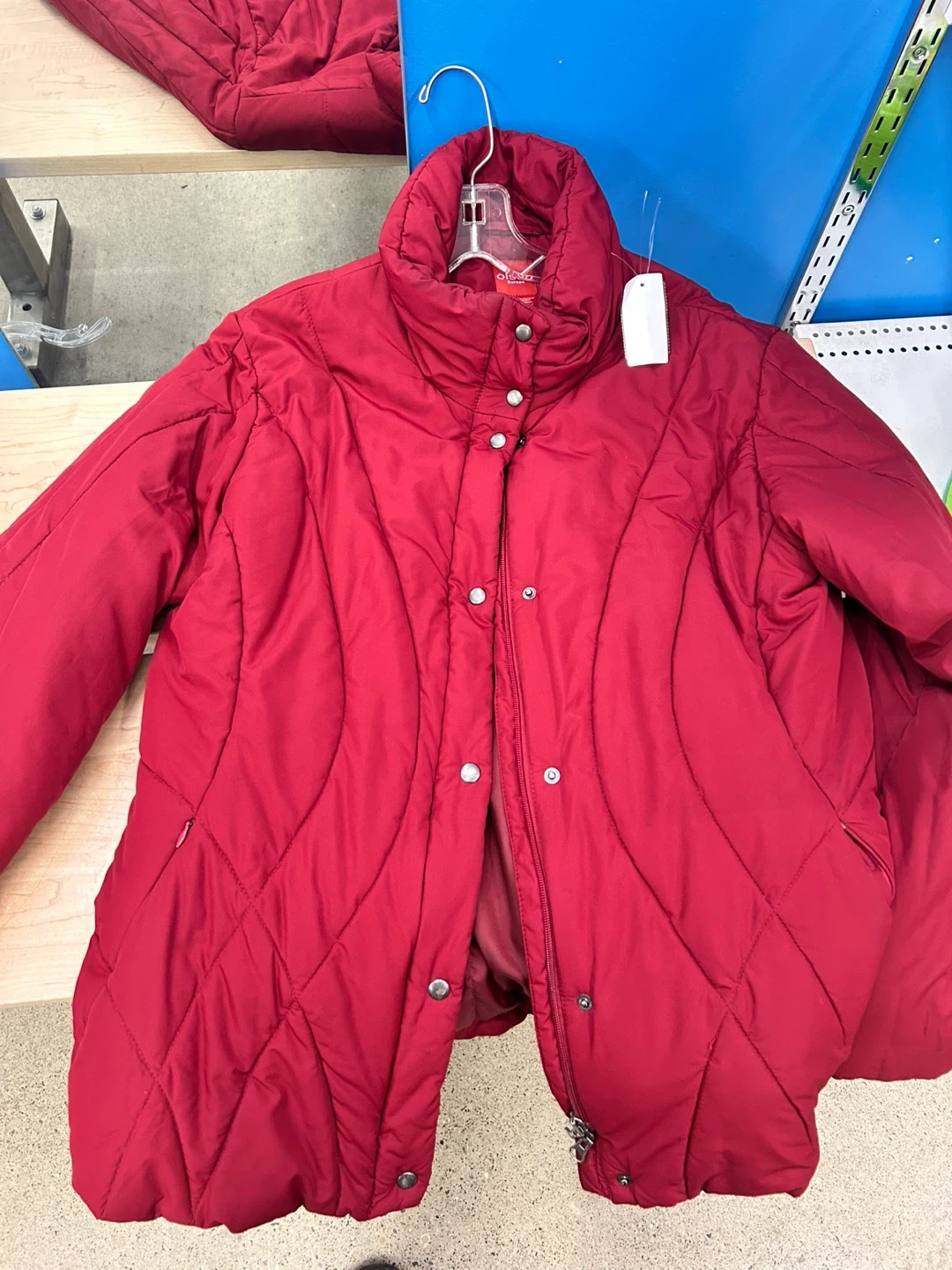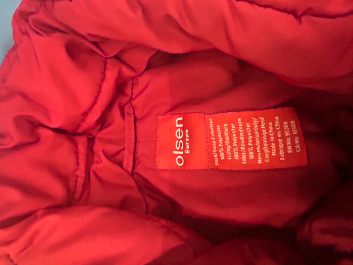 This red Olsen Europe puffer jacket is made with a 100% polyester shell, lining, and fill. It features a full zip closure with snap buttons. It's a comfortable and warm option for cooler weather.