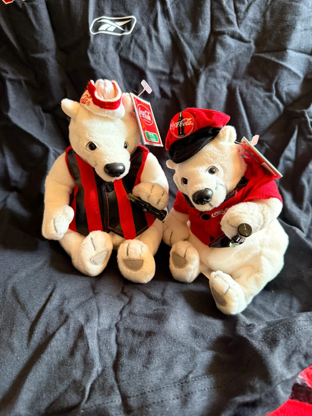 Cute Coca-Cola polar bear plush toy dressed in a red shirt and hat. It's a soft, cuddly collectible. This item is great for any Coca-Cola enthusiast!