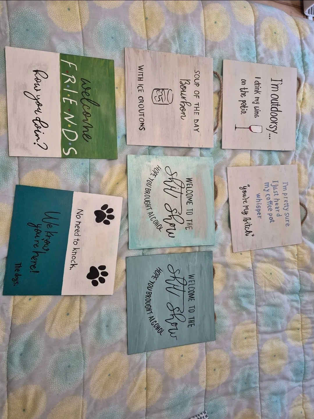 Set of seven handmade wood signs featuring different humorous and welcoming phrases. They're perfect for adding a touch of personality to your home or for a fun gift. Includes phrases like 'Welcome Friends', 'No need to knock', 'Welcome to the Shit Show', and more. Each sign has a rustic, handcrafted look.