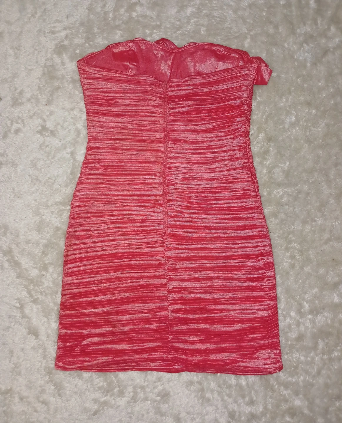 This is a cute strapless mini dress in a pink colour. It has a unique ruched design and a floral detail on the top. It's perfect for a night out or a special occasion!