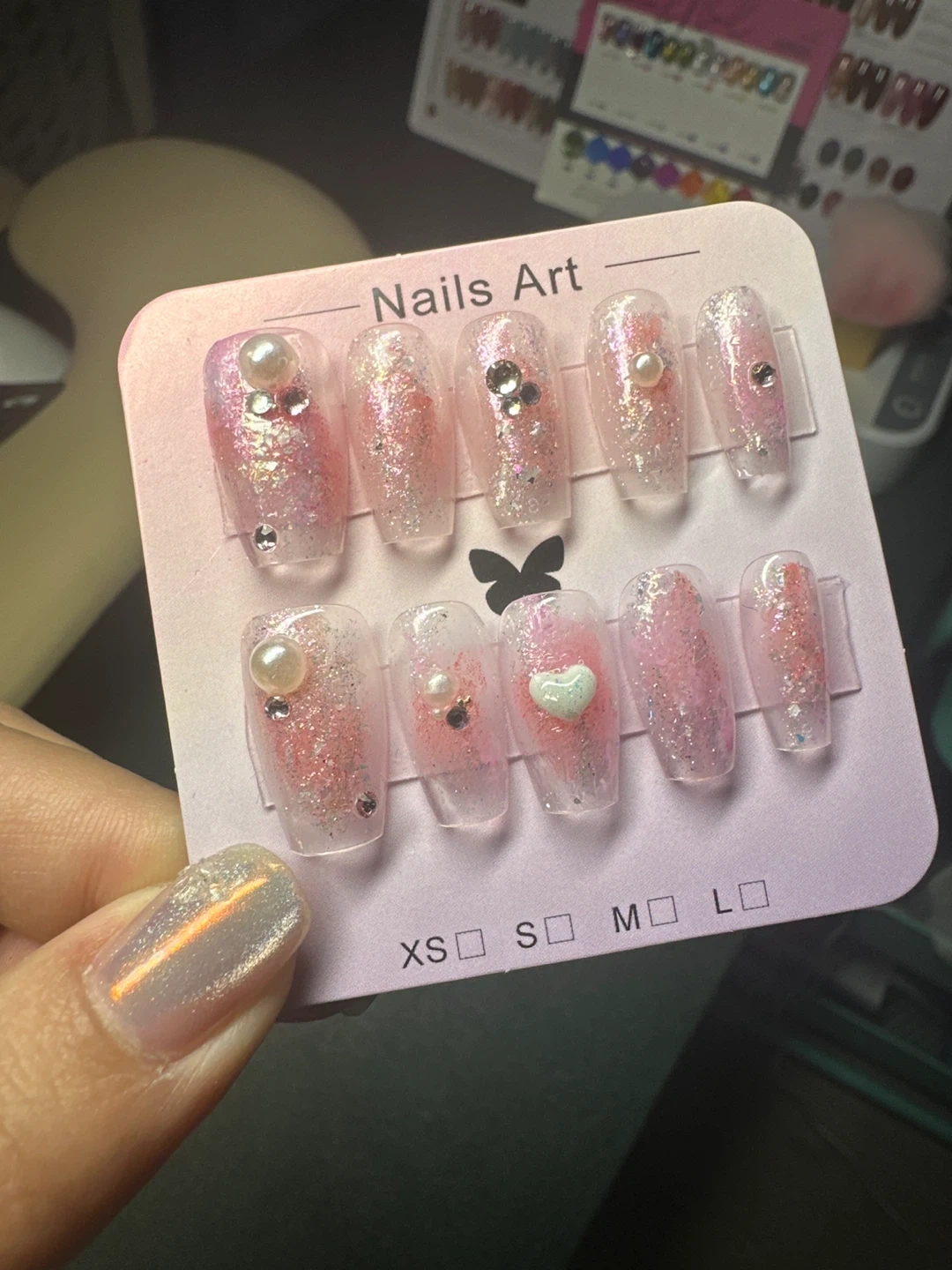 Set of 10 press-on nails, adorned with pink glitter, pearls, and sparkling gems. Features a cute heart accent nail. Available in sizes S, M,