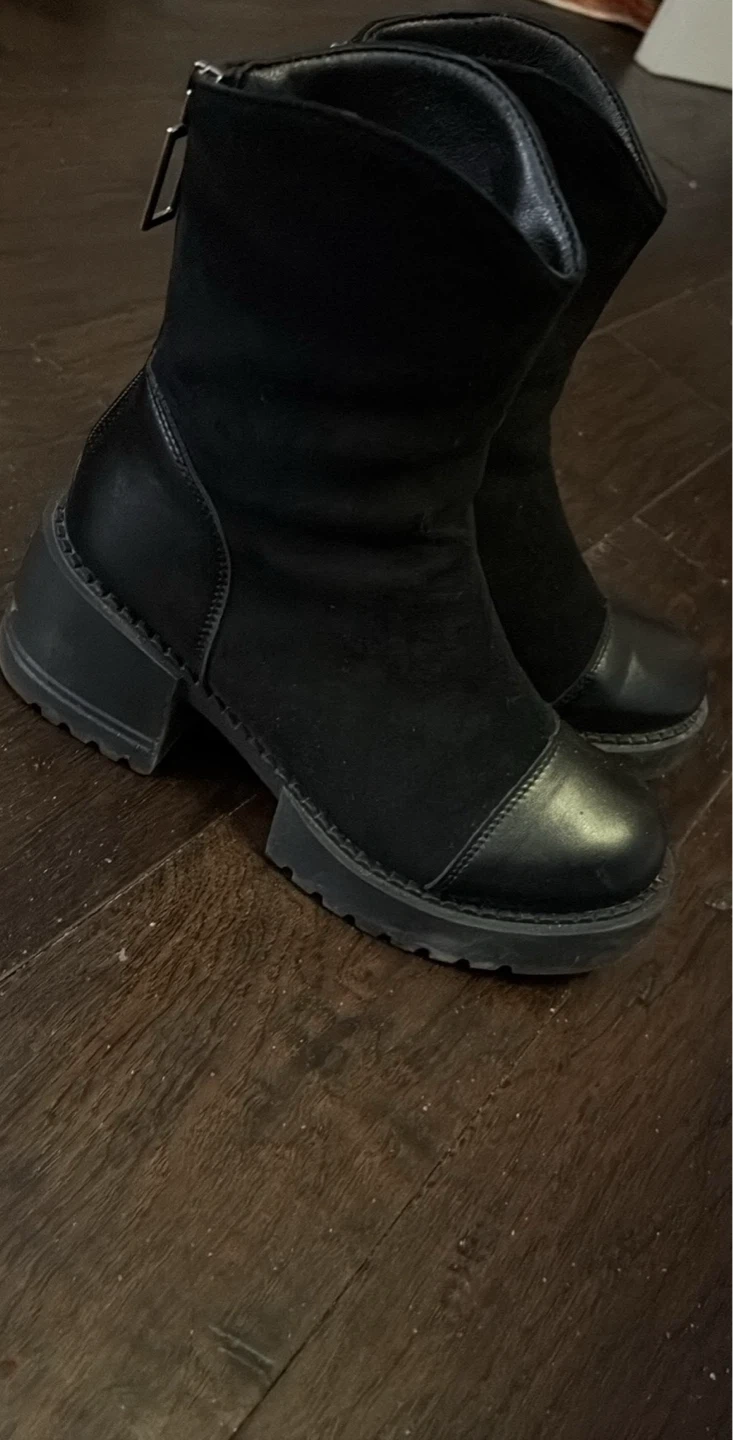 Stylish black ankle boots, crafted from a mix of leather and suede. Features a convenient zip closure at the back. These boots are great for adding a bit of edge to any outfit!