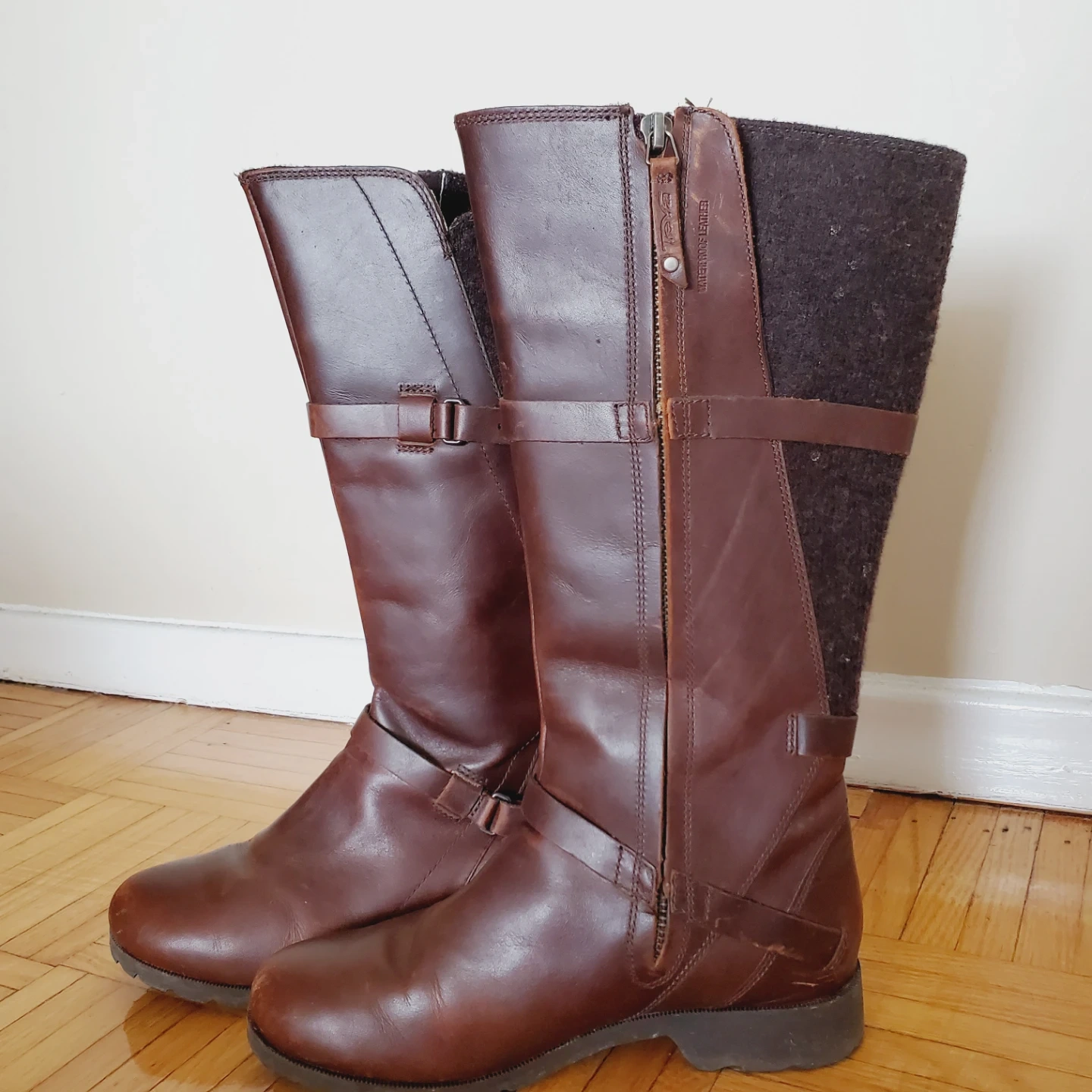 These stylish and beautiful brown tall boots are made with waterproof leather and wool. They feature side zippers for easy wear. Perfect for keeping your feet warm and dry in the winter or fall.