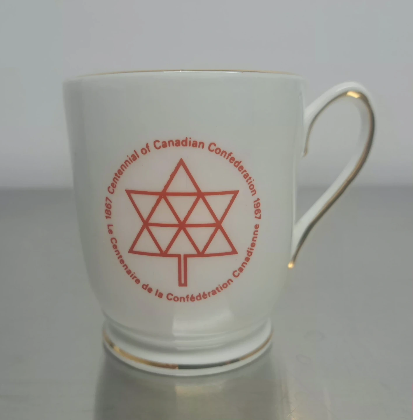 This set celebrates the 1967 Centenial of Canadian Confederation. It includes a fine bone china mug made in Staffordshire, England, and a commemorative pin and coin. The mug features the stylized maple leaf symbol and dates 1867-1967.