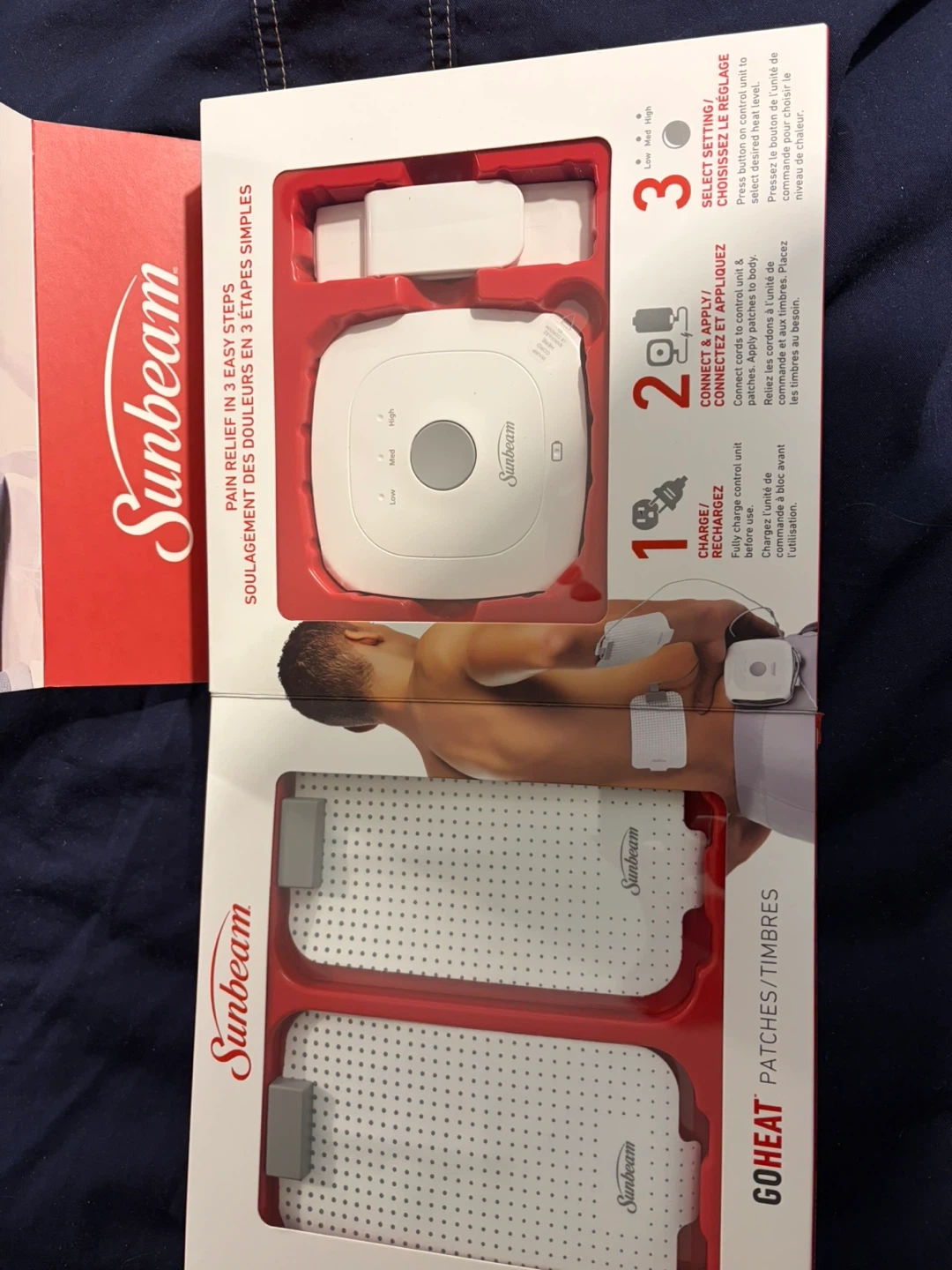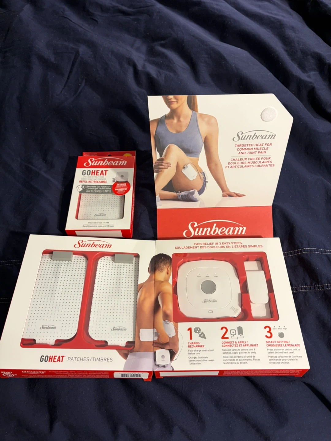Sunbeam GoHeat portable heated patches starter kit and refill kit. Includes one rechargeable control unit and two reusable gel patches. Patches are 7.6 x 12.7 cm (3x5 in).